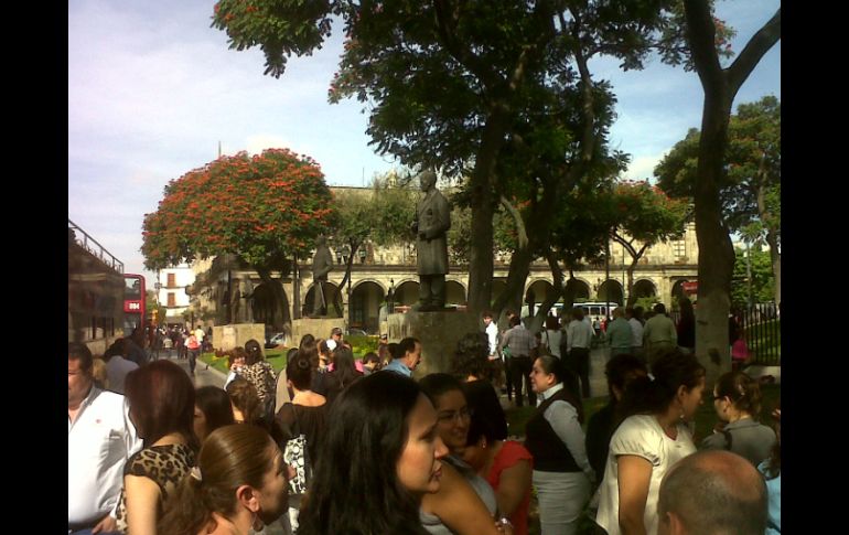 Jalisco | La alarma fue activada por un menor, según confirma Protección Civil Evacuan el Palacio Municipal tapatío La alarma fue activada por un menor, según confirma Protección Civil y Bomberos de Guadalajara Por: EL INFORMADOR 17 de octubre de 2012 - 10:57 hs Los servidores públicos lograron evacuar el edificio en dos minutos con 50 segundos. / GUADALAJARA, JALISCO (17/OCT/2012).- Los servidores públicos del Ayuntamiento de Guadalajara fueron evacuados de emergencia de sus oficinas en el Palacio Municipal tapatío, luego de que se accionara la alarma del edificio aproximadamente a las 10:40 horas, sin que se conociera de manera precisa lo que estaba sucediendo. Alrededor de 350 trabajadores y funcionarios, además de los regidores que se encontraban en el inmueble, se trasladaron a la Rotonda de los Jaliscienses Ilustres, que es el punto de reunión para este tipo de sucesos (y así lo han preparado en sus simulacros). Rogelio Hernández Martínez, primer oficial de la Dirección de Protección Civil y Bomberos de Guadalajara, informaría posteriormente que la alarma se encendió debido a que un menor la activó; al parecer, el niño no está en pleno uso de sus facultades mentales. La alarma del Palacio Municipal avisó a la Dirección de Protección Civil y Bomberos, de ahí que personal de esta dependencia se presentara en el sitio, donde hizo una revisión del mismo. Los servidores públicos evacuaron en dos minutos con 50 segundos. EL INFORMADOR / LUIS HERRERA Temas Ayuntamiento de Guadalajara Municipios Palacio de Gobierno Protección Civil Guadalajara Recibe las últimas noticias en tu e-mail Todo lo que necesitas saber para comenzar tu día Registrarse implica aceptar los Términos y Condiciones
