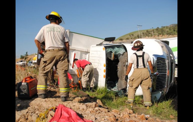 Jalisco | A la altura del kilómetro 13, un camión con tres personas en su interior volcó Fallece en volcadura sobre carretera Guadalajara-Colotlán A la altura del kilómetro 13, un camión con tres personas en su interior volcó Por: EL INFORMADOR 25 de julio de 2011 - 10:02 hs El conductor perdió el control al salirse de la cinta asfáltica provocando así la volcadura del vehículo. O. RUVALCABA / ZAPOPAN, JALISCO (25/JUL/2011).- La volcadura de un camión del municipio de Zapopan la mañana de este lunes dejó una persona fallecida y dos heridos, en la carretera que conduce de Guadalajara a Colotlán. El accidente ocurrió en la vía mencionada, a la altura del kilómetro 13, donde se volcó el camión de basura con placas JN14620, el cual era conducido por Miguel Orozco Chávez, de 67 años de edad, acompañado además de Camerino Melendez Ávila, de 38, quienes resultaron heridos, sin embargo falleció quien viajaba como copiloto, Miguel Tinoco Orozco, de 48 años. De acuerdo con las primeras investigaciones de agentes de la Procuraduría estatal, el camión viajaba en el sentido Colotlán-Guadalajara cuando salió de la cinta asfáltica y al tratarse de incorporar, el chofer perdió el control y terminó con el coche volcado en los carriles contrarios sobre una cuneta. El cuerpo fue rescatado por bomberos municipales y entregado a personal del Servicio Médico Forense (Semefo). Por momentos la vía tuvo que ser cerrada a la circulación, mientras los rescatistas llevaban a cabo sus labores. Se espera que alrededor de las 11:30 horas, la circulación vuelva a la normalidad, pues cuando eran las 10:50 horas continuaban los trabajos de remoción del automotor. En el punto, la circulación de vehículos registra problemas. EL INFORMADOR / OMAR RUVALCABA Temas Seguridad Accidentes con muertes en Jalisco Bomberos de Zapopan Colotlán Lee También El supermercado más caro de Jalisco se encuentra en Guadalajara: Profeco Profeco revela cuál es el supermercado más económico de Jalisco Charros de Jalisco busca redondear el año Hospitales psiquiátricos enfrentan saturación Recibe las últimas noticias en tu e-mail Todo lo que necesitas saber para comenzar tu día Registrarse implica aceptar los Términos y Condiciones