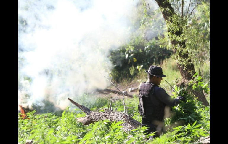 CIUDAD DE MÉXICO (25/ENE/2017).- Policías federales localizaron ocho zonas acondicionadas y sembradas con plantas de mariguana en las laderas de un cerro de la localidad de Tesistán, en el municipio de Zapopan, Jalisco.En coordinación con personal de la Fiscalía General del Estado de Jalisco, implementaron un cerco de seguridad, donde confirmaron que había aproximadamente 157 mil 800 plantas distribuidas en 25 mil 600 metros cuadrados, informó la Comisión Nacional de Seguridad (CNS).En un comunicado, precisó que en los ocho sembradíos fueron arrancadas de raíz las plantas con un peso aproximado de 86 mil 300 kilogramos y posteriormente incinerarlas.Como muestra, se tomaron ocho plantas, que quedaron puestas a disposición del agente del Ministerio Público de la Federación en Guadalajara, Jalisco para su análisis y continuar con las investigaciones correspondientes.