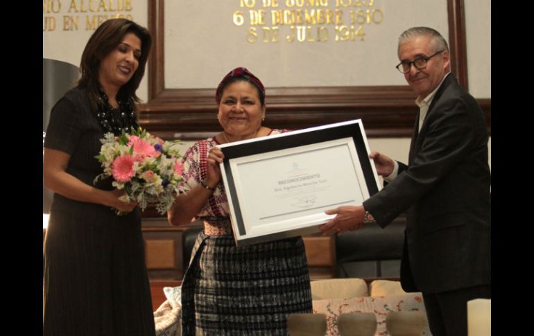 GUADALAJARA, JALISCO (18/AGO/2016).- Por su trayectoria en defensa de los derechos humanos, de los indígenas y su lucha por la igualdad de género, Enrique Ibarra Pedroza, secretario general de Guadalajara, y Lorena Martínez Ramírez, presidenta del DIF municipal, entregaron un reconocimiento a Rigoberta Mechú Tum, Premio Nobel de la Paz 1992. "Existen pocos luchadores sociales como la doctora Menchú Tum. Influyó en tres aspectos fundamentales en América Latina: reivindica los derechos históricos negados a los indígenas, ha apoyado la desmilitarización de los pueblos y defendió la reivindicación de la mujer en la sociedad", comentó el secretario general. En su mensaje, Menchú Tum dijo que en su lucha, "el triunfo que queremos es una memoria colectiva, por eso nos impacta cada vez que hay una representación de discriminación, de odio, del bullying". Además, mencionó que lo más importante.para llegar a la paz es "hacer una agenda común, para un bienestar común. En México necesitamos una agenda común, una agenda para una calidad educativa, que incluya enaltecer la dignidad de nuestros niños y de nuestras niñas, para así asegurar un futuro de paz". Además, resaltó la campaña lanzada este miércoles en la ciudad de México, llamada "Vámonos respetando", que busca impulsar el respeto hacia las mujeres y "que esperamos que deje una huella". Después del evento, en rueda de prensa, Menchú Tum dio a conocer que está trabajando con la Universidad de Guadalajara para traer su cátedra, que en estos momentos imparte en la Universidad Autónoma de México, y para lograr una educación integral y de respeto a los derechos humanos. Menchú Tum es una líder indígena Guatemalteca, impulsora de los derechos de los indígenas, razón por la cual fue expulsada de su país y merecedora del Premio Nobel de la Paz en 1992. EL INFORMADOR/ ELIZABETH MONDRAGÓN