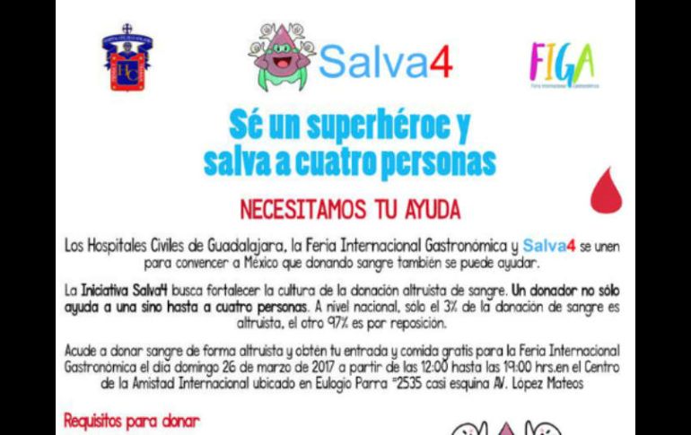 GUADALAJARA, JALISCO (22/MAR/2017).- Una pequeña acción puede generar un gran cambio, eso es lo que quiere demostrar la Dra. Natalia Villava Von Der Heyde quien decidió crear una iniciativa para promover la donación de sangre altruista en Guadalajara.El nombre de la campaña es "Salva4" pues, según explica la Dra. Villava, son justamente cuatro las personas que se pueden ver beneficiadas por cada donación de sangre, por desgracia, a nivel nacional, solo el 3% de la donación de sangre es altruista, el otro 97% es para reposición.Esta iniciativa de reciente creación cuenta con el apoyo de los Hospitales Civiles de Guadalajara y el del Cuerpo Consular de Jalisco quienes están listos para dar un paso más allá en busca de las donaciones, teniendo como marco la Feria Internacional Gastronómica (FIGA) que organizan en la ciudad. Salva4, el Cuerpo Consular Jalisco y los Hospitales Civiles trabajan en conjunto; todas las personas que acudan a donar sangre de forma altruista, a cualquier hospital civil de Guadalajara, podrán ingresar a la feria con su comprobante de donación y ahí recibirán un vale para comida, que podrán canjear en cualquiera de los más de 40 puestos de alimentos en el lugar.Además, la Dra. Villava ya está buscando otros eventos y dinámicas para que, una vez que termine la feria, pueda seguir promoviendo la donación en la ciudad.Conoce más sobre "Salva4" en sus Redes Socialeshttps://www.facebook.com/Salva4gdl/ https://twitter.com/Salva4gdlPara saberAl llegar al Hospital Civil y mencionar que eres donador altruista recibirás atención inmediata.Para ser donador altruista es necesario cumplir con los siguientes requisitos:- Ayuno de 4 horas como mínimo y 10 horas como máximo.- Identificación oficial vigente con fotografía.- Tener entre 18 a 65 años de edad, con un peso mayor a 50 kg.- Considerarse sano (sin fiebre, tos, gripe, diarrea o cualquier otra infección en los últimos 15 días)- No haber tomado medicamentos y ni consumido alcohol en las últimas 24 horas.- En los últimos 28 días no haber recibido ninguna vacuna.- No haberse sometido a un procedimiento odontológico en los últimos 7 días.- En caso de ser mujer, no estar embarazada, ni lactando y que en los últimos 6 meses no haya tenido algún parto, aborto o cesárea.- No haber contraído Paludismo o enfermedad de Chagas, ni haber tenido contacto con la “Chinche Besucona”.- No haber padecido crisis convulsivas en los últimos 3 años.- No padecer arritmias, angina inestable, trombosis arterial o venosa, Esclerosis de las coronarias o enfermedad de Creutzfeldt-Jakob (Enfermedad de las Vacas locas).- No tener factores de riesgo para contraer hepatitis y/o SIDA.- No haberse realizado ninguna cirugía en los últimos 6 meses.- No haber consumido drogas, realizado piloelectrólisis, acupuntura, tatuajes, perforaciones, endoscopia o cateterismo cardiaco, o haber recibido alguna transfusión de sangre o hemocomponente en los últimos 12 meses.- No haber tenido relaciones sexuales con alguna persona que no sea tu pareja en los últimos 12 meses.- Medir más de 1.55 metros.Sobre la Feria Internacional GastronómicaLos platillos del FIGA serán preparados por chefs de los países participantes, así como algunos cónsules y ciudadanos de los países que toman parte en el encuentro.Dónde: Centro de la Amistad Internacional (Eulogio Parra #2539, Lomas de Guevara)Cuándo: Domingo 26 de marzo de 12:00 a 19:00 hrs.Cuánto: La entrada tiene un costo de $40.00