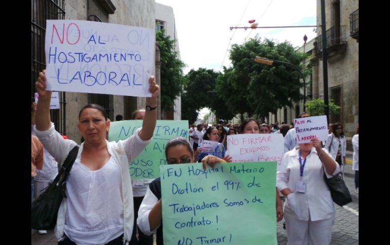 Jalisco | Alrededor de mil personas se pronuncian contra los nuevos contratos Inicia manifestación de empleados del Seguro Popular Alrededor de mil personas del Seguro Popular se pronuncian contra nuevos contratos que les quieren obligar a firmar Por: EL INFORMADOR 8 de julio de 2013 - 10:04 hs El contingente se encuentra en este momento a las afueras del Congreso del Estado. / GUADALAJARA, JALISCO (08/JUL/2013).- Alrededor de mil empleados del Seguro Popular y de base de diferentes municipios del Estado de Jalisco, iniciaron su manifestación para pronunciarse en contra de los nuevos contratos que el programa quiere que firmen, con una empresa outsourcing. La cita para el encuentro fue a las 10:00 horas, en la calle de la Secretaría de Salud Jalisco (SSJ), en donde permanecieron alrededor de media hora. De ahí partieron los empleados eventuales de la Zona Metropolitana de Guadalajara, así como de algunos basificados de La Barca, Lagos de Moreno, Ocotlán y Puerto Vallarta, que vinieron a apoyar el contingente. El motivo sigue siendo el mismo desde el viernes pasado, que alzaron la voz en la explanada del Hospital General de Occidente, lugar de trabajo de muchos de ellos, en donde no les permitieron entrar a laborar, pues su contrato venció el pasado 30 de junio y se les dio un nuevo contrato a firmar, lo cual no quieren hacer porque lo consideran ilegal. Con el grito "No firmar" y mantas con la misma leyenda, el contingente parte se encuentra en el Congreso del Estado, en donde entregarán un pliego petitorio a los diputados, para posteriormente ir a Plaza de Armas a fin de ser escuchados por el secretario de Gobierno, Arturo Zamora, o el propio gobernador, Aristóteles Sandoval. De paso, gritan afuera de la Junta de Conciliación Arbitraje. Dicen, se niegan a entablar conversación con el director del Seguro Popular estatal, Antonio Cruces Mada. EL INFORMADOR/ THAMARA VILLASEÑOR Temas Manifestaciones en Jalisco Salud Secretaría de Salud Jalisco Seguro Popular Lee También EN VIVO: Maiceros bloquean carretera Guadalajara-Morelia ¿Por qué productores agrícolas bloquearon la carretera Morelia-Guadalajara? Camiones de carga, los más afectados por bloqueos de maiceros SAT, abierto al diálogo con trabajadores después del paro de labores Recibe las últimas noticias en tu e-mail Todo lo que necesitas saber para comenzar tu día Registrarse implica aceptar los Términos y Condiciones
