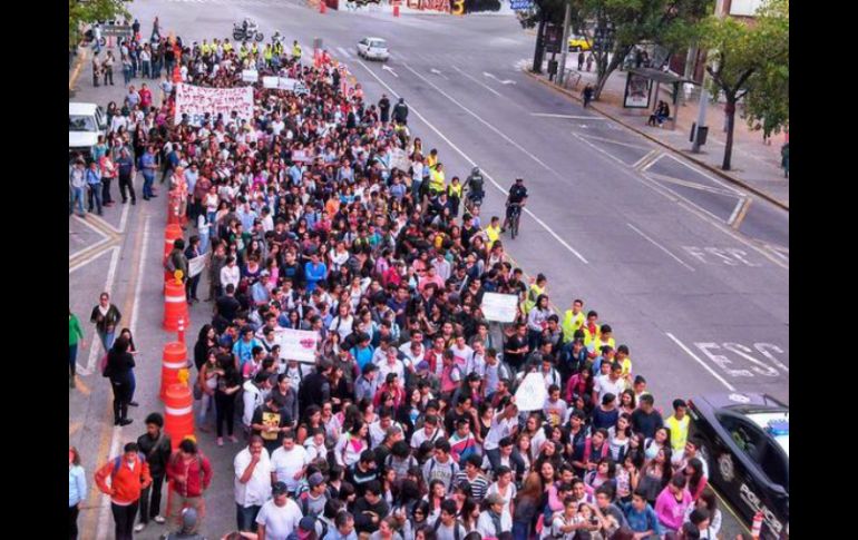 Jalisco | Varios contingentes avanzan hacia el Centro de Guadalajara Inicia marcha de UdeG en contra de la violencia Varios contingentes avanzan hacia el Centro de Guadalajara para luego dirigirse a Rectoría Por: EL INFORMADOR 22 de octubre de 2014 - 09:18 hs GUADALAJARA, JALISCO (22/OCT/2014).- A partir de las 10:00 horas, se registran cierres viales en avenidas importantes a causa de la marcha realizada por alumnos de la Universidad de Guadalajara ( UdeG) en contra de la violencia. Los cierres viales se expanden de cuatro puntos: Rectoría, La Normal, Plaza de la Bandera y La Minerva. El que representa mayor complicación es el de avenida Alcalde, donde la vialidad se ve afectada desde Ávila Camacho hasta La Paz, se sugiere tomar rutas alternas. El primer contingente partió de La Normal, y de acuerdo al vocero de la Policía Vial de ahí salieron alrededor de dos mil personas. También se registró un grupo partir de la Calzada Olímpica, por lo que se cerró Javier Mina y Belisario. Asimismo otro contingente de estudiantes salió de la Minerva y otro más y de Plaza de la Bandera, hasta el momento no hay reporte de afluencia de los otros tres grupos. La marcha fue convocada por la Federación de Estudiantes Universitarios en reclamo por los 43 normalistas desaparecidos en Iguala, Guerrero, y a eso se suma el reclamo por la muerte de un estudiante de la carrera de Ingeniería en Mecatrónica del Centro Universitario de los Lagos, quien fue detenido por la policía municipal de Guanajuato y horas después fue encontrado muerto. Con información de Violeta Meléndez Temas Manifestaciones en Jalisco Vialidad UdeG FEU ZMG Guerrero Lee También Gobierno de Jalisco reconoce histórico triunfo en la Paralimpiada Nacional EN VIVO: Maiceros bloquean carretera Guadalajara-Morelia ¿Qué exigen los productores de maíz? Aquí te decimos Liberan carretera Guadalajara-Morelia tras bloqueo de maiceros Recibe las últimas noticias en tu e-mail Todo lo que necesitas saber para comenzar tu día Registrarse implica aceptar los Términos y Condiciones