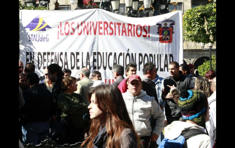 Jalisco | Esta vez se manifestaron en las inmediaciones del Palacio de Gobierno Intercalan sedes de protestas Esta vez se manifestaron en las inmediaciones del Palacio de Gobierno Por: EL INFORMADOR 11 de diciembre de 2010 - 05:04 hs Al rededor de 500 jóvenes se congregaron para manifestarse contra el Gobierno del Estado. E. PACHECO / GUADALAJARA, JALISCO (11/DIC/2010).- Estudiantes y profesores de la Universidad de Guadalajara (UdeG) ahora llevaron una botarga de un burro a Palacio de Gobierno, como parte de las acciones de la “resistencia civil pacífica” para exigir al Ejecutivo de Jalisco el pago de los 701 millones de pesos que adeuda a la casa de estudios. Hace dos días, estudiantes de distintos planteles de la UdeG llevaron un burro real a Casa Jalisco, primer animal que participa en las protestas de la Universidad. Temas Manifestaciones en Jalisco Educación local UdeG Presupuesto UdeG Lee También Maestros se revelan ante programa "La escuela te extraña", acusan aumento de carga laborar Aeropuerto Internacional de Guadalajara estrena servicio de shuttle Conoce los tres mejores Airbnb en Guadalajara Fiscalía habría vinculado a proceso a más de 70 presuntos agresores de mujeres Recibe las últimas noticias en tu e-mail Todo lo que necesitas saber para comenzar tu día Registrarse implica aceptar los Términos y Condiciones