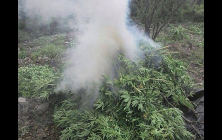 Jalisco | El hallazgo se dio tras la colaboración e investigación por parte de las dos instancias La PGR y Fiscalía destruyen 122 mil plantas de mariguana El hallazgo y destrucción se dio tras la colaboración e investigación por parte de las dos instancias Por: EL INFORMADOR 23 de agosto de 2014 - 16:08 hs Las plantas incineradas tenían una altura de entre 100 y 150 centímetros. Tomada de @FiscaliaJal. ESPECIAL / GUADALAJARA, JALISCO (23/AGO/2014).- Personal de la Procuraduría General de la República ( PGR) delegación Jalisco y de la Fiscalía General destruyeron más de 122 mil plantas de mariguana contenidas en 25 plantíos en los municipios de San Juanito Escobedo y Ahualulco del Mercado, informó la dependencia federal. El hallazgo y destrucción se dio tras la colaboración e investigación por parte de las dos instancias. Según las autoridades, se encontró el primer hallazgo en un lugar llamado La Estrella, del ejido La Estancita en San Juanito Escobedo. Ahí se encontraban 14 extensiones de terreno de distintas medidas las cuales estaban sembradas con la droga. Y en municipio de Ahualulco del Mercado se encontraron 11 terrenos más en un predio denominado La Vencedora de la Mina en el ejido Ahualulco. En total, las 25 extensiones de terreno sumaron 32 mil 300 metros cuadrados sembrados con 122 mil 650 plantas de mariguana de entre un metro y metro y medio de altura cada una. Pese a la magnitud del hallazgo y los terrenos, las autoridades aseveran que no detuvieron a ninguna persona, aunque en el primer plantío había un campamento instalado en un área de 10 por 10 metros. Se procedió al aseguramiento de los enervantes y posterior destrucción. En las acciones participaron 80 elementos de Fuerza Única Regional y 12 de la PGR. El Ministerio Público Federal comenzó con las investigaciones para poder dar con las personas que se hacían cargo de la actividad que incurre en delitos contra la salud. Temas Seguridad PGR Mariguana Fiscalía de Jalisco (FGE) Lee También Cartucho Pablo Lemus y diputados mantienen diálogo sobre la reforma judicial Bosque de maple en Jalisco, el otoño más espectacular de México está aquí Mantendrán maiceros protesta en caseta de Ocotlán Recibe las últimas noticias en tu e-mail Todo lo que necesitas saber para comenzar tu día Registrarse implica aceptar los Términos y Condiciones