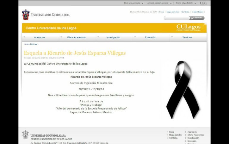 Jalisco | Es detenido por la policía municipal y horas después fue encontrado muerto La UdeG condena el asesinato de estudiante en Guanajuato Ricardo de Jesús Esparza Villegas era estudiante de la carrera de Ingeniería en Mecatrónica del Centro Universitario de los Lagos Por: EL INFORMADOR 21 de octubre de 2014 - 12:03 hs El Centro Universitario de los Lagos lamenta el hecho y publica en su sitio web una esquela. ESPECIAL / lagos.udg.mx GUADALAJARA, JALISCO (21/OCT/2014).- La Universidad de Guadalajara condenó la desaparición y muerte de Ricardo de Jesús Esparza Villegas, estudiante de la carrera de Ingeniería en Mecatrónica del Centro Universitario de los Lagos, quien fue detenido por la policía municipal de Guanajuato y horas después fue encontrado muerto. El pasado 18 de octubre, Esparza Villegas había asistido al Festival Internacional Cervantino. Iba acompañado de otros estudiantes. A través de un comunicado, la UdeG señaló que "la comunidad universitaria se solidariza con la familia del joven universitario y manifiesta su indignación ante lo sucedido. Esta Casa de Estudio solicita al presidente municipal de Guanajuato y al gobierno de esa entidad, la inmediata investigación de los hechos. Del mismo modo pide al gobierno del Estado de Jalisco su inmediata intervención para que colabore con las investigaciones y se castigue a los responsables de este lamentable crimen". El presidente de la Federación de Estudiantes Universitarios ( FEU), José Alberto Galarza, señaló que a casi un mes de la desaparición de los normalistas de Ayotzinapa y con la muerte de Ricardo de Jesús Esparza Villegas, la situación ha llegado al límite. Agregó que, según el testimonio de las personas que acompañaban a Ricardo, a los policías no les gustó la actitud del estudiante y por eso lo detuvieron. Galarza pidió a las autoridades de Guanajuato que esclarezcan el crimen, investiguen el caso y juzguen a los culpables. "No podemos seguir con la cabeza abajo, esperando la muerte o temiendo todos los días. Debemos alzar la voz, gritar fuerte y claro y exigir a los gobernantes que hagan su trabajo y dejen de estar buscando votos y simpatías". El "Rojo" resaltó que no se puede permitir "que siga habiendo este tipo de canalladas por parte de las personas que se supone les pagamos para que nos cuiden. Tenemos que hacer algo para que esto no vuelva a ocurrir". EL INFORMADOR / GONZALO JÁUREGUI Temas Educación UdeG FEU Festival Internacional Cervantino CULagos Lee También Inauguran Festival Cervantino con mensaje para Veracruz Dónde ver EN VIVO el México vs Argentina por el Mundial Sub-20 ¿Dónde ver EN VIVO el partido amistoso México vs Colombia? El precio de la paz en Gaza Recibe las últimas noticias en tu e-mail Todo lo que necesitas saber para comenzar tu día Registrarse implica aceptar los Términos y Condiciones