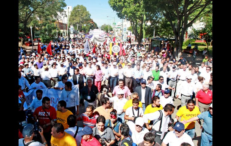 Jalisco | Conflicto por presupuesto La UdeG suspende marcha por visita de Felipe Calderón La universidad dio a conocer ayer mediante un comunicado, que la manifestación pactada para hoy no se llevará a cabo Por: EL INFORMADOR 4 de octubre de 2010 - 01:21 hs La décimo quinta marcha de protesta se suspendió por la visita del Presidente Felipe Calderón. A. GARCÍA / GUADALAJARA, JALISCO (04/OCT/2010).- Por medio de un comunicado, la Universidad de Guadalajara dio a conocer ayer que suspenden la décimo quinta marcha de protesta que tendría lugar hoy lunes, “debido a la visita del Presidente Felipe Calderón”. El viernes pasado tuvo lugar la movilización número 14, incluida la megamarcha del pasado 29 de septiembre (en la imagen), que concurrió en el Centro de la ciudad, todo esto un lapso de 33 días. Pese a la pausa de hoy, las autoridades universitarias confirman que mantendrán sus demandas por un mayor presupuesto estatal. Temas Felipe Calderón Educación local UdeG Presupuesto UdeG Recibe las últimas noticias en tu e-mail Todo lo que necesitas saber para comenzar tu día Registrarse implica aceptar los Términos y Condiciones