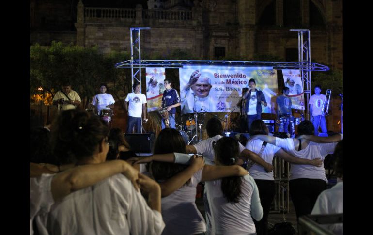 Jalisco | Al evento en Plaza Liberación acudieron alrededor de 300 personas Le cantan a la próxima llegada del Papa Al evento en Plaza Liberación acudieron alrededor de 300 personas Por: EL INFORMADOR 21 de marzo de 2012 - 20:15 hs A los jóvenes que se encontraban en el lugar se les invitó a pedir la sede de la Jornada Mundial de la Juventud. / GUADALAJARA, JALISCO (21/MAR/2012).- La Plaza de la Liberación fue testigo de la "Fiesta de la esperanza", ofrecida con motivo de la próxima visita del Papa Benedicto XVI a León, Guanajuato, del 23 al 26 de marzo. Durante el evento, al que acudieron alrededor de 300 personas, según informaron los organizadores, los asistentes corearon y bailaron los temas cantados por la Sonora Ktolik. El grupo integrado por jóvenes tapatíos ofreció temas como "El río", "Adicto", "Si tuvieras fe", entre otros. El evento también contará con la presencia del cantante Martín Valverde, el ex futbolista Ramón Morales, Conchis Hinojosa, Rogelio Casasola, entre otros. El padre Octavio Ramírez instó a que durante la visita del Papa los jóvenes tapatíos pidan la sede de la Jornada Mundial de la Juventud. Se prevé que el evento termine alrededor de las 22:40 horas. INFORMADOR / GONZALO JAÚREGUI Temas Iglesia Católica en Jalisco Municipios .El Papa Benedicto XVI en México Lee También Pablo Lemus y diputados mantienen diálogo sobre la reforma judicial Clima en Ciudad de México hoy: el pronóstico para el miércoles 15 de octubre de 2025 Checo Pérez podría estar presente en el GP de México Bosque de maple en Jalisco, el otoño más espectacular de México está aquí Recibe las últimas noticias en tu e-mail Todo lo que necesitas saber para comenzar tu día Registrarse implica aceptar los Términos y Condiciones