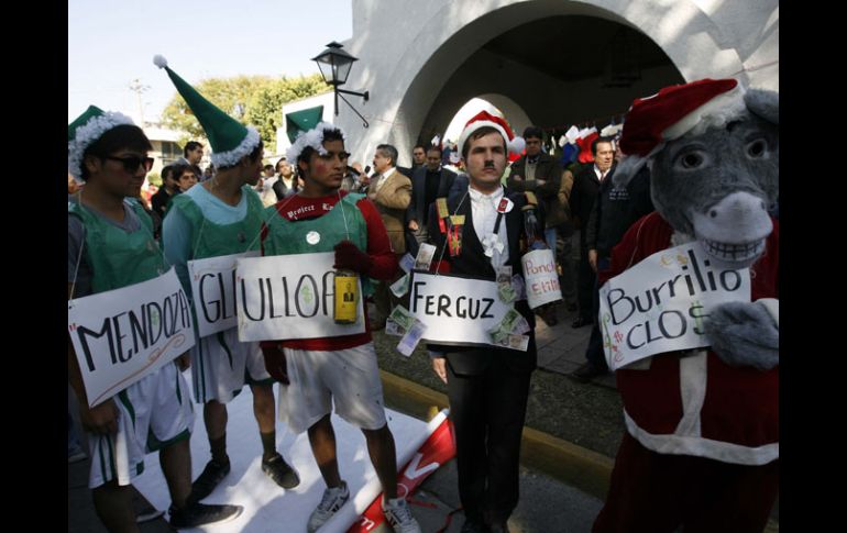 Jalisco | Las acciones de “resistencia civil pacífica” podrían trasladarse al Congreso del Estado Llevan representación teatral de “Burrilio Clos” a Casa Jalisco Burrilio Clos repartió simbólicamente 85 mdp a sus amigos, 121 mdp a novelas y espectáculos, 135 mdp en donativos, y 559 millones de pesos para publicidad Por: EL INFORMADOR 14 de diciembre de 2010 - 13:45 hs Presentan personajes en alusión al gobernador, al secretario general de Gobierno, Finanzas, Promoción Económica y Educación. E. BARRERA / GUADALAJARA, JALISCO (14/DIC/2010).- Con una representación teatral, en la que participaron “Burrilio Clos”, en alusión al gobernador de Jalisco, Emilio González Márquez, “Ferguz”, al secretario general de Gobierno, Fernando Guzmán Pérez Peláez, así como los elfos “Mendoza”, “Ulloa” y “Gloria”, en alusión a los secretarios de Finanzas, Promoción Económica y Educación, Martín Mendoza, Alonso Ulloa, y Antonio Gloria Morales, respectivamente, alumnos de la Universidad de Guadalajara, emprendieron esta mañana las acciones de la “resistencia civil pacífica” para exigir el pago de los 701 millones de pesos que el Ejecutivo adeuda a la casa de estudios desde 2007 por varias bolsas de concurso de participación federal. A las afueras de Casa Jalisco y acompañado por alrededor de 350 estudiantes de distintos centros universitarios, Burrilio Clos repartió simbólicamente 85 millones de pesos (MDP) a sus amigos, 121 millones de pesos a novelas y espectáculos, 135 MDP en donativos, y 559 millones de pesos para publicidad. “Intentamos representar lo que ha venido haciendo el gobernador”, señaló durante la protesta el presidente de la FEU, Marco Antonio Núñez Becerra. En la puesta en escena, “Burrilio Clos” también repartió chile al ITEI y a los Hospitales Civiles, pepinos al Congreso, camote a la UdeG, una corneta a Guadalajara y “mentaditas de madre” (pastillas de menta pequeñas) al pueblo. Mañana miércoles, las acciones de “resistencia civil pacífica” podrían trasladarse al Congreso del Estado, con motivo de la discusión del presupuesto de egresos 2011 para Jalisco, que realizarán los diputados, adelantó el representante estudiantil. EL INFORMADOR / RAFAEL ZAPATA Temas Manifestaciones en Jalisco Pasado y presente de Jalisco Presupuesto UdeG Lee También ¿Buena idea o plan electoral? Jalisco define plan estatal de abasto de energía sustentable Zapopan entrega recursos a damnificados de La Martinica Cartucho Recibe las últimas noticias en tu e-mail Todo lo que necesitas saber para comenzar tu día Registrarse implica aceptar los Términos y Condiciones