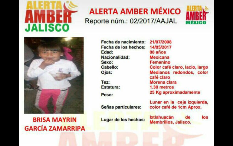 GUADALAJARA, JALISCO (17/MAY/2017).- La Fiscalía General del Estado informó este miércoles de la localización de la menor Brisa Mayrin García Zamarripa, por la cual se había activado una Alerta Amber el pasado 15 de mayo. La pequeña fue encontrada sin vida.El pasado 15 de mayo se emitió la alerta donde se informaba que la infante de ocho años de edad fue vista por última vez un día antes afuera de su domicilio en Ixtlahuacán de los Membrillos. “Se considera que la integridad de la niña se encuentra en riesgo toda vez que puede ser víctima de la comisión de un delito”.Así, la menor fue localizada tras realizar cateos a dos fincas cercanas al lugar donde desapareció, en la colonia Los Sabinos. Su cuerpo fue trasladado al Servicio Médico Forense para determinar sus causas de muerte. Policías investigadores, Ministerio Público y peritos de Ciencias Forenses acudieron al lugar para avanzar en las investigaciones, establecer el móvil y solucionar el crimen.