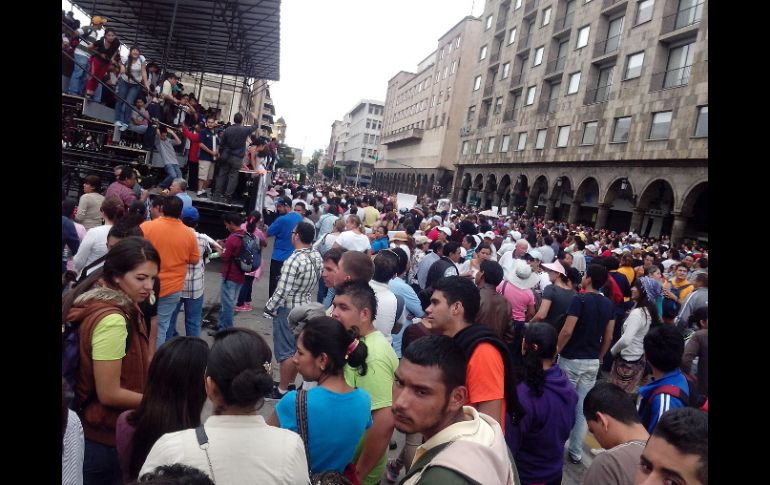 Jalisco | Son alrededor de cinco mil personas las que se concentran en el lugar Maestros llegan a Plaza de Armas Alrededor de cinco mil trabajadores de la educación llegaron a Plaza de Armas para protestar contra la reforma educativa Por: EL INFORMADOR 4 de septiembre de 2013 - 12:26 hs Avenida 16 de septiembre está cerrada desde calle La Paz hasta Hospital. / GUADALAJARA, JALISCO (04/SEP/2013).- Después de dos horas de caminar sobre la totalidad de los carriles de Avenida Alcalde, desde La Normal, los maestros, padres de familia y estudiantes que conforman la protesta contra la reforma educativa llegaron a Plaza de Armas en torno a las 13:00 horas, su destino final. La última cifra que daban agentes viales era de cinco mil manifestantes en torno a las 12:40. Los organizadores hablaban de siete mil. No obstante, al final del día el comandante Conrado Casillas declaró que en total fueron cerca de mil 600 los manifestantes y que se dispuso a 50 agentes viales para hacer los cortes a la circulación vial. Acusó que el tránsito se vio afectado en avenidas paralelas como Federalismo y la Calzada Independencia. Juan Carlos Banderas, del Movimiento de Bases Magisteriales --uno de los colectivos organizadores-- dijo que decidieron manifestarse pese a que el Senado aprobó anoche la Ley del Servicio Profesional Docente porque tienen la esperanza de que el Presidente Enrique Peña Nieto vete las leyes aprobadas y que conforman la reforma o que inicie controversia. Maestros entrevistados consignaron que temen por sus empleos. No están en contra de las evaluaciones a su persona, pero indican que no saben quién los evaluará ni bajo qué criterio. Otros docentes consideran que se abre la puerta a la privatización de la educación. Hilda González, maestra de una primaria en Tlajomulco, opina que la educación de calidad no solo depende de los profesores, sino que también debe haber escuelas "dignas", con material e infraestructura pertinentes. Ella tiene 15 años de ejercer y cree que la capacitación para actualización que reciben del Estado es "baja, limitada e inconexa". No está en contra de ser evaluada. Una supervisora que no quiso dar su nombre, pero que provenía de Tomatlán, apuntó que por medio de exámenes "a modo" el Gobierno pretende correr a profesores, para evitar gastos de jubilación. Carlos Scheel Martín, secretario general del Sindicato Único de Académicos del Colegio de Bachilleres de Jalisco (SUACOBAEJ), dijo: "No nada más la reforma afecta a los profesores, la privatización de la educación afecta a la sociedad, porque se puede llegar incluso a la obligación de las cuotas de padres de familia y dejarles a ellos la manutención de las escuelas. Obviamente los derechos laborales de los profesores se ven afectados". El 30 de agosto integrantes de bases magisteriales marcharon también de La Normal a Palacio de Gobierno, pero eran unos 300. En todo momento han acompañado la marcha unos 300 policías de Guadalajara y al menos 100 agentes viales. No se reportan incidentes, pero algunas manifestantes han corrido de la protesta a trabajadores de Televisa, con gritos y en dado momentos, empujones. La Policia tuvo que intervenir. Pretenden veto a las leyes Juan Carlos Banderas, del Movimiento de Bases Magisteriales --uno de los colectivos organizadores de la marcha--, dijo que decidieron manifestarse pese a que el Senado aprobó la noche del martes la Ley del Servicio Profesional Docente, porque tienen la esperanza de que el Presidente Enrique Peña Nieto vete las leyes aprobadas o promueva una controversia constitucional. Anunció que habrá una nueva marcha el sábado, a las 11:00 horas, de La Normal a Plaza de Armas. Él irá ese mismo día con una veintena de compañeros a la Ciudad de México para acordar con la Coordinadora Nacional de Trabajadores de la Educación (CNTE) las acciones para la "desobediencia civil" que implementarán por aprobar la reforma educativa. Durante la jornada, los asistentes proclamaron que querían un paro nacional, por lo que Juan Carlos propondrá en la capital que éste ocurra. EL INFORMADOR/ MIRIAM PADILLA Temas Manifestaciones en Jalisco Vialidad Reforma Educativa Avenida Alcalde Lee También Detienen a asesino de joven en partido de futbol ¿Cuál era la relación entre el barco pirata hundido en Vallarta y Colón? Así estará Guadalajara por la tarde; ¿lloverá? Tras persecución policial, localizan 70 kilos de marihuana en Tuxpan Recibe las últimas noticias en tu e-mail Todo lo que necesitas saber para comenzar tu día Registrarse implica aceptar los Términos y Condiciones