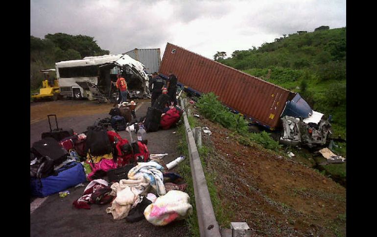 Jalisco | Caminos y Puentes refiere que no hay plazo para reestablecer la circulación Mantienen cierre de autopista a Colima por accidente Capufe refiere que no hay plazo determinado para reabrir la circulación Por: EL INFORMADOR 24 de julio de 2011 - 13:33 hs Los vehículos siniestrados obstruyen la carretera. El cierre se prolongará mientras se retiran las unidades y los escombros. M. PATIÑO / - Mueren ocho en camionazo sobre la autopista Guadalajara a ColimaGUADALAJARA, JALISCO (24/JUL/2011).- Continúa cerrada la circulación en la autopista Guadalajara a Colima por el accidente ocurrido durante las primeras horas del domingo que cobró la vida de ocho personas. La delegación local de Caminos y Puentes Federales detalla que debido a las labores de remoción de escombros de los vehículos siniestrados el cierre se prolongará por tiempo indefinido. Los viajeros que transiten por esta ruta, serán desviados para recorrer cinco kilómetros por la vía libre para reincorporarse después de Sayula. El flujo vehícular por el tramo modificado es considerado 'complicado' en los informes que proporcionan las dependencias de seguridad. Minutos antes de las 7:00 de la mañana del domingo, un choque de frente entre un camión de vacacionistas y un tráiler, provocó el deceso de ocho personas y 37 heridos a la altura del kilómetro 70. Temas Seguridad Accidentes con muertes en Jalisco Carreteras de Jalisco Capufe Lee También Lluvias dejan 29 muertos en un día en México Astros de Jalisco doblega a Xalapa y se pone a un juego de la Final de Zona Escuela Gómez de Mendiola celebra sus primeros 75 años al servicio de los tapatíos Proyectan expansión de Placencia Muebles Recibe las últimas noticias en tu e-mail Todo lo que necesitas saber para comenzar tu día Registrarse implica aceptar los Términos y Condiciones