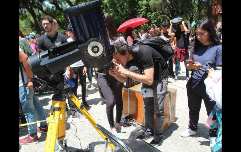 GUADALAJARA, JALISCO (21/AGO/2017).- Más de 400 personas se dieron cita este lunes en el Bosque Los Colomos para apreciar el transcurso del eclipse de sol y disfrutar de las actividades preparadas por el área de Educación y Cultura Ambiental del Bosque en conjunto con el club astronómico Orión. A las 10:30, los líderes del club Orión comenzaron la charla para explicar a chicos y grandes cómo ocurriría en proceso en el que la luna ocultaría al Sol, desde la perspectiva de la Tierra. Luego de esto, los asistentes pudieron participar en la creación de sus propios "botescopios" en los que podían ver el reflejo del eclipse dentro del artefacto. Los pequeños eran sin duda los más emocionados, corrían de un lado a otro para poder ver el eclipse en alguno de los seis telescopios profesionales colocados en la explanada del Bosque o por medio de aquellos que fueron elaborados de forma casera. Asombrados, se formaban una y otra vez, en compañía de sus papás para apreciar el recorrido de la luna. Otros tantos llegaron ya preparados con filtros y lentes especiales, incluso hubo quienes traían consigo caretas para soldadura. Todos ellos se mostraban solidarios y se prestaban unos a otros los instrumentos para observar el fenómeno y vivir la experiencia desde todos los ángulos. Los asistentes buscan la forma de poder capturar lo que sus ojos veían, colocaban los filtros sobre los lentes de los celulares y cámaras profesionales, sin embargo, muy pocos conseguían hacer la toma; lo importante era documentar que formaron parte de este día. Una vez que el eclipse llegó al máximo punto, cerca de las 13:04 horas, algunos de los más grandes se mostraron en desconcierto pues al parecer, esperaban que el día oscureciera, tal como ocurrió en el eclipse del 11 de julio de 1991. Sin embargo, en esta ocasión sólo pudo apreciarse poco más del 25 por ciento del fenómeno en Guadalajara. "El eclipse se veía diferente con diferentes cosas, por ejemplo, con la placa de soldar se veía verde. El año pasado hubo un eclipse pequeño pero las nubes lo taparon y no se pudo ver, entonces esta es la primera vez que veo bien un eclipse", dijo asombrado uno de los pequeños que se encontraban en el lugar. Isabela, de cinco años de edad, recibe educación en casa, ella no va a la escuela porque sus padres prefieren que obtenga el conocimiento de especialistas en diferentes temas, por esta razón fue que la llevaron al bosque para que viviera de cerca el eclipse, de una forma más didáctica. "Yo hice un botescopio en el que se veía el sol redondo. Me gustó la plática que dio el señor sobre el eclipse porque así entendí lo que iba a pasar con el sol y la luna", dijo la pequeña. La misión de Orión Fundado en febrero del 2001, el club astronómico Orión es un grupo orientado a la promoción de la astronomía, sin fines de lucro, con el objetivo de difundir el conocimiento de esta ciencia, principalmente entre los niños y los jóvenes. El club realiza una conferencia el último sábado de cada mes, con invitados capacitados en temas de Astronomía, Cosmología, Astrofísica y demás temas relacionados con la afición a observar las estrellas. La próxima conferencia se llevará acabo el sábado 26 de agosto, a las 17:00 horas con el tema "Telescopios en la historia". Si quieres asistir a la conferencia o deseas obtener mayores informes sobre el club astronómico, pueden ingresar al sitio web de la organización: http://www.clubastronomicoorion.org/ EL INFORMADOR / RUBÍ BOBADILLA