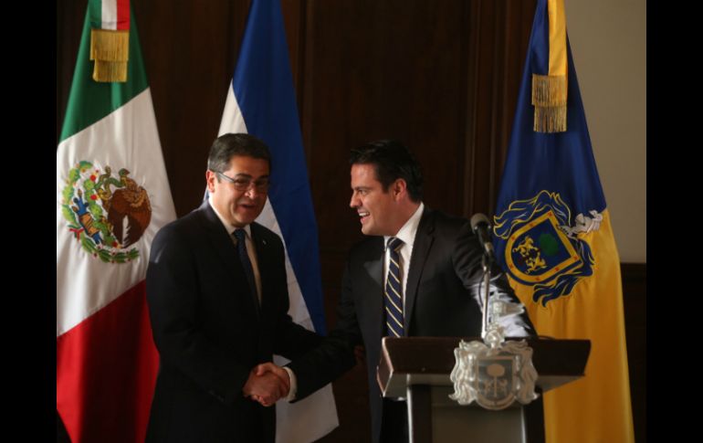 GUADALAJARA, JALISCO (07/SEP/2016).- El presidente de Honduras, Juan Orlando Hernández Alvarado, realizó una visita a Jalisco para entablar reuniones con empresarios del Consejo Mexicano de Comercio Exterior (COMCE) y con el gobernador del Estado, Aristóteles Sandoval Díaz. Uno de los temas más importantes que se trataron en su encuentro con el gobernador, en Palacio de Gobierno, así como con empresarios, en Expo Guadalajara, fue el de la migración de personas hacia Estados Unidos. Sin dar más detalles, Hernández Alvarado habló de los esfuerzos que se han hecho junto con México y Estados Unidos para priorizar el tema migratorio y de seguridad, que va de la mano con la iniciativa del Plan de la Alianza para la Prosperidad que lanzaron Honduras, Guatemala y El Salvador. Por su parte, Sandoval Díaz destacó que el problema de migración es un tema preocupante en común entre los mexicanos y los hondureños, el cual se debe atacar de raíz, no con políticas de prohibición. "Para nadie es desconocido que uno de los problemas que nos atañe, aunque no sea directamente en nuestro caso, es el de la migración de ciudadanos al Norte del continente; para el presidente Juan Orlando, la migración ilegal a los Estados Unidos no se combate con barreras, con muros, sino atajando el problema en el sitio de los problemas, como la pobreza, la inseguridad, que empujan a millones de ciudadanos a migrar hacia el Norte". Además de la migración, el presidente de Honduras manifestó el trabajo que Jalisco ha hecho en torno al emprendimiento, tecnología, agroindustria y la parte automotriz y el turismo, que impulsan el desarrollo económico y el crecimiento social en el Estado. Como parte de los resultados de la visita del presidente de Honduras, se estableció una próxima visita del primer mandatario estatal al país centroamericano, así como de representantes de la iniciativa privada y emprendedores, a fin de que se puedan materializar proyectos de crecimiento económico. "Queremos invitarlos a que vayan a Honduras para que pronto podamos tener los diferentes portafolios, tener al sector privado de ambos países, de ambos estados, el sector gobierno como facilitadores y establecer una gran alianza de gran provecho para Jalisco, México y Honduras". EL INFORMADOR / THAMARA VILLASEÑOR