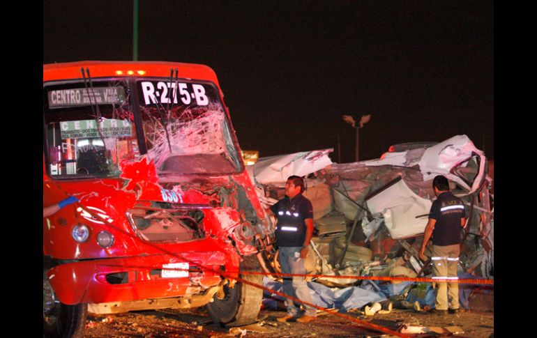 Jalisco | El conductor de una camioneta invadió el carril contrario y se impactó con un camión Mueren cinco personas en accidente vehicular Todos los fallecidos viajaban a bordo de una camioneta que se impactó de frente a un camión de la ruta 275B Por: EL INFORMADOR 21 de octubre de 2013 - 05:32 hs Autoridades señalan que los tripulantes de la camioneta viajaban a exceso de velocidad. / SAN PEDRO TLAQUEPAQUE, JALISCO (21/OCT/2013).- Dos automotores destrozados y cinco personas fallecidas fue parte del escenario de un accidente vehicular, ocurrido en la carretera Libre a Zapotlanejo. Los hechos ocurrieron alrededor de las 23:00 horas de este domingo, en la citada vía, a la altura de la Central Nueva de Autobuses, entre los límites de los municipios de San Pedro Tlaquepaque y Tonalá. A ese punto, acudió personal de la Unidad Estatal de Protección Civil y Bomberos Jalisco (UEPCBJ), bomberos municipales, así como paramédicos para atender a las víctimas, pero a su llegada encontraron a tres hombres y dos mujeres fallecidos. De acuerdo con Manuel Nájera, jefe de bomberos tonaltecas, los cinco fallecidos viajaban en una camioneta Murano blanca, por la citada vía en el sentido Zapotlanejo-Guadalajara, cuando invadieron los carriles contrarios y se estrellaron con camión de la ruta 275B, con número económico 8381. El autobús de pasajeros era conducido por Raúl Lugo, quien resultó con algunos golpes leves, y los pasajeros que llevaba no fueron afectados. “Cinco fallecidos, iba en una camioneta Murano, tenemos exceso de velocidad, tenemos la combinación de alcohol y volante, trae la trayectoria de derrape de 40 o 50 metros cambia de carril, y se impacta de frente con un camión urbano y ésta totalmente hecha pedazos (el automotor blanco), la mala combinación”, dijo Manuel Nájera. Por el accidente, la vía mencionada fue cerrada mientras que las autoridades realizaban las tareas de rescate y limpieza. En el punto del accidente fueron encontradas latas de cerveza, así como rastro de otros licores por lo que hace presumir, que los tripulantes del auto iban bajo los efectos del alcohol al momento del accidente. Una gran cantidad de ropa nueva también fue encontrada en el lugar. Personal de la Fiscalía Central de Jalisco y del Instituto Jalisciense de Ciencias Forenses (IJCF) acudieron para levantar los cuerpos de los fallecidos y trasladarlos a la morgue metropolitana. Posteriormente, las víctimas fueron identificadas extraoficialmente como: Guelaguetza Velázquez Segura, de 14 años; Luisa Itzel Velázquez Martínez, de 16 años; Luis Donaldo Fierros Velázquez, de 19 años. Además de Omar Fierros Castellanos, de 21 años, y Manuel Estrada López, de 20 años. El dato De acuerdo con estadísticas del IJCF, desde el 1 de enero al 21 de octubre de 2013, han muerto 38 personas por accidentes viales en el municipio de San Pedro Tlaquepaque. Los "levantó" el ruido "Ya estábamos dormidos, cuando el ruido del choque nos despertó salimos a ver qué pasaba mientras que otros vecinos corrían para la Libre a Zapotlanejo y venimos, y estaban ahí tirados los muchachos", dijo Maricela, vecina de la calle Hipódromo. La mujer de 56 años de edad, explicó que no es la primera vez que sucede un choque o volcadura en ese lugar. "La gente viene muy rápido por la carretera, y no es la primera vez que pasa un accidente, si no son choques, son atropellados porque la gente se cruza la carretera (...) y no hay puente peatonal", agregó Maricela, quien acudió con sus hijos y esposo a ver el accidente. En el punto del choque, se dieron cita al menos unos 70 "mirones" para presenciar las tareas de rescate de los bomberos. Temas Seguridad Accidentes con muertes en Jalisco IJCF Lee También Omar 'N' es vinculado a proceso por presunto abuso sexual infantil agravado Inicia entrega de tarjetas Pensión Mujeres Bienestar en Jalisco; ¿cómo y dónde recogerla? DIF Jalisco impulsa campaña de adopciones de niñas, niños y adolescentes SMN advierte: Tormenta Raymond dejará lluvias intensas y fuertes vientos en 4 estados Recibe las últimas noticias en tu e-mail Todo lo que necesitas saber para comenzar tu día Registrarse implica aceptar los Términos y Condiciones