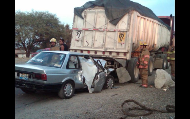 Jalisco | El auto en el que viajaban se impactó en la parte trasera de un tráiler Mueren cuatro hombres en accidente carretero El auto en el que viajaban se impactó en la parte trasera de un tráiler el cual se encontraba estacionado en el acotamiento Por: EL INFORMADOR 1 de junio de 2012 - 20:51 hs El automóvil que se impactó fue un Nissan tipo Tsuru con placas de circulación JAZ-82 93. / GUADALAJARA, JALISCO (01/JUN/2012).- Sobre la Carretera Guadalajara-Chapala, a la altura del entronque a Cajititlán, cuatro hombres perdieron la vida, luego de que el auto en el que viajaban impactara en la parte trasera de un tráiler; el carguero se encontraba estacionado en el área de acotamiento. Los fallecidos se trasladaban en un vehículo Nissan tipo Tsuru, de modelo atrasado, color gris, con placas de circulación JAZ-82 93. Hasta las 20:30 horas, las víctimas no habían sido identificadas. Personal del Servicio Médico Forense realizó el levantamiento de los cuerpos para trasladarlos a la morgue de la ciudad, con la pretensión de que sean identificados y reclamados de manera oficial por algún familiar. Respecto al conductor del tráiler, las autoridades no supieron de él. Temas Seguridad Accidentes con muertes en Jalisco IJCF Lee También Esto costará el Gas LP en Jalisco en la semana del 13 al 18 de octubre Así se vive la Romería 2025 este domingo 12 de octubre (FOTOS) Elementos de seguridad detienen a traficante sueco en Cancún "La Virgen me salvó del cáncer de mama", agradecen la vida, salud y bienestar en la Romería 2025 Recibe las últimas noticias en tu e-mail Todo lo que necesitas saber para comenzar tu día Registrarse implica aceptar los Términos y Condiciones