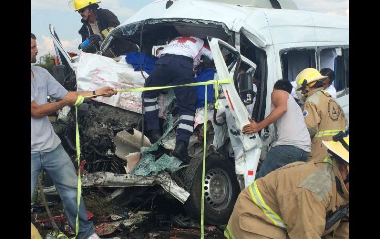 GUADALAJARA, JALISCO (13/SEP/2016).- Un choque ocurrido entre tres vehículos la tarde de este martes en el municipio de Jalostotitlán dejó un saldo de once personas muertas y ocho más lesionadas, informó la Unidad Estatal de Protección Civil y Bomberos (UEPCB).El hecho fue reportado alrededor de las cinco de la tarde tras lo que se trasladaron unidades de rescate del municipio y estatales al punto conocido como La Curva del Muerto, en el kilómetro 53+400 de la carretera Jalostotitlán-San Juan de los Lagos.En dicho punto encontraron tres vehículos impactados, una camioneta de turismo tipo Sprinter contra una grúa que transportaba un taladro de perforación de pozos, además de un auto sedán.El el sitio encontraron a ocho personas muertas y tres más lesionadas en estado de grave a regular, las cuales fueron trasladadas al Hospital Regional, dos mujeres y un hombre, el conductor del Sprinter. Los rescatistas procedieron a la revisión de la camioneta para descartar que hubiera más lesionados.Poco después, la UEPCB reportó la muerte de las tres personas lesionadas, lo cual ocurrió durante el trayecto hacia su atención médica.Personal del Servicio Médico Forense se trasladó al lugar para levantar a los cuerpos. Se trató de un choque frontal entre la grúa y la camioneta. Aunque existieron más personas lesionadas aún no se confirma el número. El chofer de la grúa escapó del lugar.
