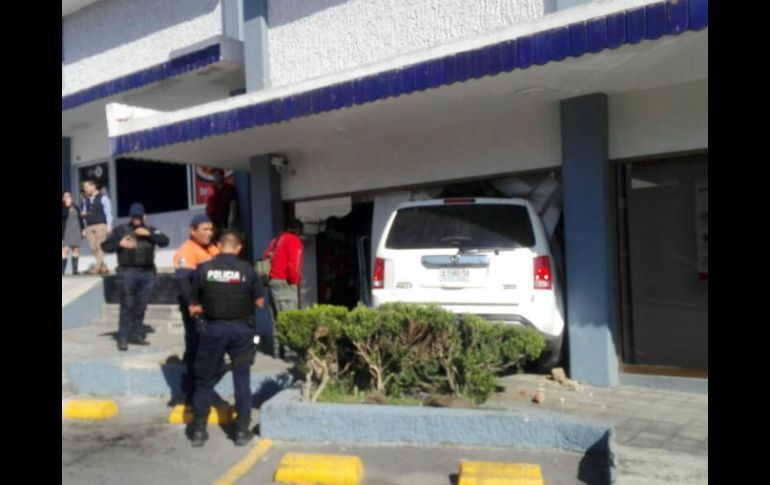 GUADALAJARA, JALISCO (27/FEB/2017).- Una mujer que perdió el control de su camioneta chocó el vehículo contra una sucursal de un banco, en la colonia El Capullo, en Zapopan.Los hechos ocurrieron esta tarde cuando la mujer, de 59 años de edad, conducía por la avenida Ávila Camacho, a bordo de una Honda Pilot blanca.Según los reportes hechos por paramédicos de Bomberos de Zapopan, la señora sufrió lesiones leves, pero que ameritaron que recibiera atención en el sitio.Dentro del banco nadie sufrió lesiones: la camioneta impactó el edificio por el lado de la silla del gerente, quien se había levantado de su escritorio.