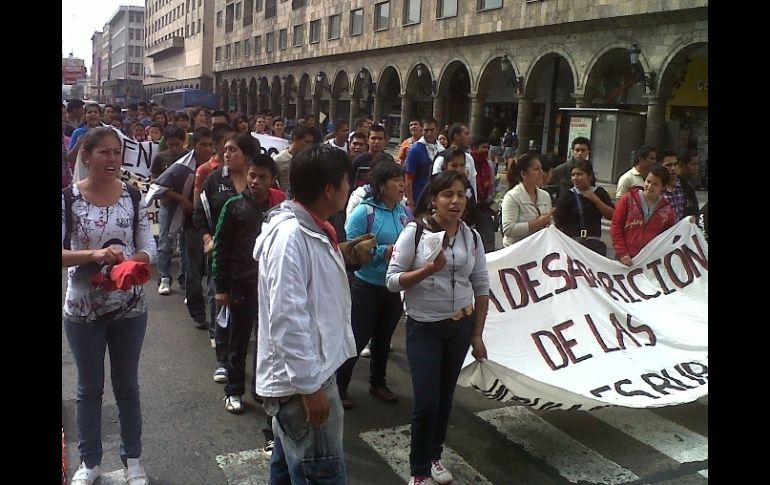 Jalisco | Son cerca de dos mil 500 jóvenes que se congregaron en Plaza Juárez Normalistas bloquean un sentido de avenida Alcalde También hay estudiantes provenientes de Puebla, Ciudad de México, Michoacán y Zacatecas, que se unen a las petición Por: EL INFORMADOR 27 de octubre de 2011 - 11:35 hs Dos mil 500 personas recorren la vía desde la Plaza Juárez. / GUADALAJARA, JALISCO (27/OCT/2011).- Alrededor de dos mil 500 jóvenes estudiantes de las escuelas Normales de distintas entidades del país, se congregaron esta mañana en Plaza Juárez en un mitin que avanza por el carril de sur a norte de Avenida Alcalde hasta llegar a la Normal Superior, donde exigen hablar con Antonio gloria Morales, Secretario de Educación Jalisco (SEJ). Los manifestantes demandan a la institución educativa resolución al pliego petitorio que presentaron hace un año, donde señalan las problemáticas en el internado de la Normal de Atequiza y aumento de la matrícula, que según señalan, fue recortada. Aunque las peticiones responden a las necesidades del plantel del municipio de Atequiza, los dos mil 500 jóvenes que han tomado la vialidad no son únicamente estudiantes de dicha universidad, sino de Puebla, Ciudad de México, Michoacán y Zacatecas, que se unen a las petición. “Pueblo, disculpa, no queremos molestar, pero este gobierno nos obliga a protestar”, entonan al unísono a su paso, pues bloquean la circulación de las calles transversales a Alcalde a la altura que van transitando. EL INFORMADOR / VIOLETA MELÉNDEZ Temas Manifestaciones en Jalisco SEJ Educación local Estudiantes Antonio Gloria Morales Recibe las últimas noticias en tu e-mail Todo lo que necesitas saber para comenzar tu día Registrarse implica aceptar los Términos y Condiciones