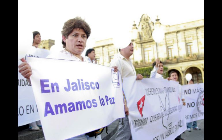 Jalisco | Marchan por la paz Organizaciones civiles piden alto a la violencia Exigen a autoridades que trabajen de manera coordinada en el tema de seguridad Por: EL INFORMADOR 3 de febrero de 2011 - 03:04 hs Vestidos en su mayoría en color blanco, ciudadanos marcharon en el Centro de la ciudad. E. PACHECO / GUADALAJARA, JALISCO (03/FEB/2011).- Al considerar que los hechos violentos registrados la noche del martes en la metrópoli fueron la gota que derramó el vaso, organizaciones ciudadanas reaccionaron con la realización de marchas para exigir la paz en Jalisco. Una de las movilizaciones constó de alrededor de 70 participantes, algunos vestidos de blanco, quienes portaban globos y banderas en ese mismo color. Estas personas pidieron a gritos y a través de pancartas más tranquilidad, seguridad y un Jalisco en paz. “Jalisco unido quiere paz”, externaron al unísono integrantes de organizaciones ciudadanas como Vanguardia, la Asociación Internacional de Abogados Penalistas, Movimiento Blanco, Asociación de Víctimas contra la Violencia Vial y Padres de Familia Contra la Violencia Escolar, entre otros. Exigen a autoridades de los distintos niveles de Gobierno que trabajen de manera coordinada en el tema de seguridad, y dejen de lado en estos momentos las aspiraciones políticas para 2012. En el caso específico de los legisladores locales, les piden realizar las reformas pertinentes en materia de seguridad para evitar actos delincuenciales como los del martes. El contingente avanzó por un carril de Avenida Alcalde-16 de Septiembre; se instalaron en Plaza Guadalajara. “Estamos inconformes, la sociedad civil ha sufrido algunos ataques inusuales, atípicos en diferentes partes de la zona metropolitana y el Estado. Lo del día de ayer fue la gota que derramó el vaso, por eso decidimos salir el día de hoy”, expresó César Íñiguez Gonzáles, representante de Vanguardia A.C. Temas Manifestaciones en Jalisco Municipios ZMG Bloqueos en ZMG Lee También ¿Cómo y dónde recoger tu tarjeta de la Pensión Mujeres Bienestar en Jalisco? DIF Jalisco impulsa campaña de adopciones de niñas, niños y adolescentes SMN advierte: Tormenta Raymond dejará lluvias intensas y fuertes vientos en 4 estados Jalisco reporta una tendencia a la baja en desapariciones Recibe las últimas noticias en tu e-mail Todo lo que necesitas saber para comenzar tu día Registrarse implica aceptar los Términos y Condiciones