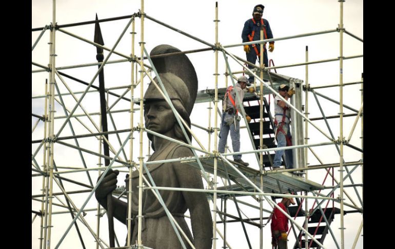 GUADALAJARA, JALISCO (03/AGO/2016).- La escultura de La Minerva será dividida en al menos dos partes para ser restaurada. El alcalde de Guadalajara, Enrique Alfaro, explicó que el monumento será intervenido en el sitio para evitar riesgos en su traslado.El análisis de la restauradora Karla Jáuregui reveló que la escultura está hueca y sólo es sostenida por varillas y un colado de concreto de dos metros en la base. Además, la capa de bronce tiene un grosor promedio de apenas seis milímetros.“Cualquier presión fuerte que se le aplique puede romperla. Es probable que tengamos que separar las dos secciones de La Minerva, la que está rellena de concreto para poder limpiarla y la que se tiene que restaurar por dentro (…) Tenemos que encontrar un método para separar las partes, elevarla y trabajar por dentro en la parte que está hueca”, explicó el presidente municipal tapatío.Ricardo Agraz, director de Proyectos del Espacio Público, precisó que La Minerva fue construida por partes. Explicó que encontraron fallas en las soldaduras y malos terminados que no unen completamente las piezas de la escultura, así como corrosión en el basamento y un orificio en la mano que sostiene la lanza por el que se cuela el agua al interior. También descubrieron acabados inadecuados y un balazo en el escudo.La restauradora Karla Jáuregui señaló que la efigie se encuentra muy afectada y en riesgo. Explicó que los daños han sido progresivos.“El concreto ya perdió sus funciones porque estaba pronosticado para durar 60 años, los cuales ya se cumplieron. También el agua clorada afectó al metal, hay daños por las vibraciones y las fluctuaciones de electricidad por las instalaciones eléctricas y hasta un pararrayos que hay en la lanza”, señaló la experta.Jáuregui dijo que se procederá a eliminar el concreto, se diseñará un nuevo sistema de sujeción, corrección de la soldadura y grietas y la eliminación de los recubrimientos y la corrosión, así como la colocación de una capa protectora y la elaboración de un plan de manejo.Enrique Alfaro estimó que los procesos podrán concluir para la celebración del Maratón de Guadalajara en noviembre. Recordó que cuentan con un techo presupuestal de ocho millones de pesos y recalcó que las dos últimas administraciones gastaron 65 millones en intervenir la zona sin arreglar la escultura.El monumento es obra del escultor Joaquín Arias, mientras que el proyecto de la glorieta fue del arquitecto Julio de la Peña. Se realizó por encargo del gobernador Agustín Yáñez y se inauguró en 1957.