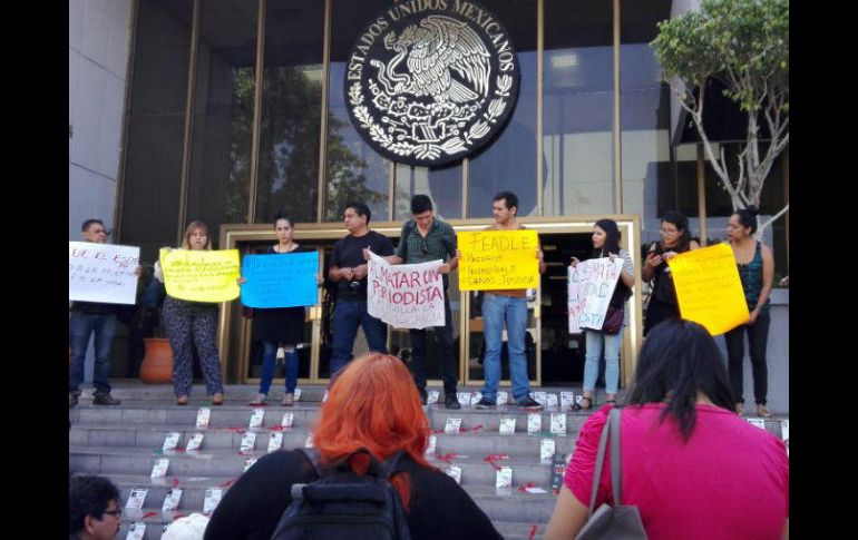 GUADALAJARA, JALISCO (16/MAY/2017).- Reporteros jaliscienses se congregaron la mañana de este martes frente a las instalaciones de la delegación de la Procuraduría General de la República. Iban a manifestar su indignación por otra muerte de un periodista mexicano, Javier Valdez, asesinado en Culiacán, Sinaloa.Javier Valdez es uno más que se suma a las estadísticas de la Fiscalía Especial para la Atención de Delitos Cometidos contra la Libertad de Expresión (Feadle), que cada año absorbe del presupuesto sin poder frenar las muertes de los comunicadores.Hacia las 9:50 comenzaron a colocar sobre la escalinata del edificio de la PGR las acreditaciones de las decenas de periodistas asesinados y algunas veladoras hasta llenar casi todos los peldaños. Otros más se colocaron con pancartas por detrás; sus consignas instaban a la cuestionable libertad de expresión que priva en México.“El Estado Mexicano asesina periodistas”, “Al matar un periodista se acuchilla la democracia”, “Políticos crimen organizado = muerte”.“¡Extra Extra! ¡Nos están asesinando!”, voceaban la última noticia —que sonaba a la de siempre— al Ministerio Público Federal, por si no acaso se había enterado, pero ni se asomaron por las ventanas.Jade Ramírez, de la Red de Periodistas de a Pie, leyó el pronunciamiento de los presentes. “Uno más de una cantidad monstruosa que acumula dolientes casos sin resolver, cinco si miramos sólo los meses que lleva este año. Cecilio Pineda, Ricardo Monlui, Miroslava Breach, Maximino Rodríguez y hoy, Javier Valdez”.“En el año 2011, cuando Javier Valdez Cárdenas recibió el premio internacional de Libertad de Prensa del Comité para la Protección de Periodistas dijo: ‘En Culiacán, Sinaloa, es un peligro estar vico y hacer periodismo es caminar sobre una invisible línea marcada por los malos que están en el narcotráfico y en el gobierno, un piso filoso y lleno de explosivos. Esto se vive en casi todo el país'”.“Esta es una guerra. Sí, pero por el control del narco, y nosotros, los ciudadanos, ponemos los muertos. Y los gobiernos de México y Estados Unidos las armas. Y ellos, los encumbrados, invisibles, agazapados, dentro y fuera de los gobiernos se llevan las ganancias”, parafraseó la lectura de Valdez cuando recibió el premio.Jade Ramírez dijo que en el país las posibilidades de que un delito quede sin castigo son de 98%; en el caso de los periodistas es de 99.7%, prácticamente impunidad absoluta. “Esta es una de las razones centrales por del por qué no cesa la violencia contra periodistas, porque los agresores se saben impunes”.El grupo se colocó en los carriles de sur a norte de 16 de Septiembre, buscando la empatía de los ciudadanos hacia las personas que llevan por oficio informar y darle voz a la sociedad. Sin embargo tenían sonidos de claxon y ofensas en respuesta.Una pancarta más vaticinaba tal reacción. “No hay ciudadanía que acompañe al periodismo, estamos solos”.