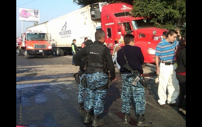 Jalisco | Policías de Tlaquepaque interceptan camión robado en Periférico y carretera a Chapala Persecución policiaca deja dos heridos e intenso tráfico Policías de Tlaquepaque interceptan camión robado en Periférico y carretera a Chapala Por: EL INFORMADOR 20 de octubre de 2011 - 08:46 hs Los ladrones de la unidad de carga finalmente fueron arrestados por los policías municipales. / TLAQUEPAQUE, JALISCO (20/OCT/2011).- Un camión de carga y su chofer fueron sorprendidos por varios ladrones lo que provocó una persecución, balacera y detenciones. El camión fue interceptado en calles de Zapopan, aunque no fue hasta el cruce de Anillo Periférico y la carretera a Chapala donde agentes de la Policía de Tlaquepaque pudieron bloquearle el paso; mientras esto sucedía los gendarmes y ladrones se enfrentaban a balazos. Producto del enfrentamiento hay dos personas heridas por arma de fuego, identificados como un policía y un sujeto sospechoso. La salida de Periférico para tomar la carretera a Chapala se encontraba cerrada debido a que el camión se estrelló en la barrera de contención lo que provocaba un intenso tráfico. EL INFORMADOR / OMAR RUVALCABA Temas Seguridad Balacera Policía de Tlaquepaque Recibe las últimas noticias en tu e-mail Todo lo que necesitas saber para comenzar tu día Registrarse implica aceptar los Términos y Condiciones