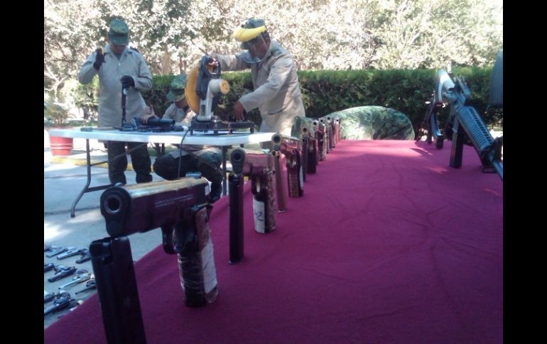 Jalisco | El armamento pertenece a decomisos realizados a la delincuencia organizada Personal militar destruye 500 armas en La Mojonera En total, se destruyeron 120 armas largas, 380 armas cortas, 442 cargadores para diversas armas y 11 mil 16 cartuchos útiles de diferentes calibres Por: EL INFORMADOR 15 de diciembre de 2011 - 11:20 hs En durante 2011, la XV Zona Militar implementa operativos para decomiso y destrucción de armamento perteneciente a la delincuencia. / ZAPOPAN, JALISCO (15/DIC/2011).- Este mediodía personal perteneciente a la XV Zona Militar llevó a cabo la destrucción de armamento relacionado a los decomisos de la delincuencia organizada. En total, se destruyeron 120 armas largas de las que destacan: cuernos de chivo y fusiles de asalto tipo AR-15 con lanzagrandas; 380 armas cortas, de las que destacan algunas cromadas, otras bañadas en oro y plata, y con incrustaciones de personajes religiosos; entre otras algunas con leyendas relacionadas con presuntos líderes de la delincuencia organizada. También se destruyeron, 442 cargadores para diversas armas y 11 mil 16 cartuchos útiles de diferentes calibres. En lo que va del año 2011, la XV Zona Militar ha destruido 452 armas largas y 998 armas cortas, seis lanzachoetes, dos lanzagranadas, 189 granadas de mano, 60 granadas, siete proyectiles, dos granadas de mortero, 10 granadas de gas, 36 mil 927 cartuchos de diferentes calibres y mil 267 cargadores para diversas armas. EL INFORMADOR / MARTÍN PATIÑO Temas Seguridad Portación de armas en Jalisco Recibe las últimas noticias en tu e-mail Todo lo que necesitas saber para comenzar tu día Registrarse implica aceptar los Términos y Condiciones