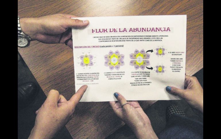 Jalisco | Proliferan víctimas de un esquema llamado 'flor de la abundancia' Pirámides para ganar dinero, riesgo de ser víctima de fraude Autoridades recomiendan dudar de entidades, organizaciones o personas que ofrecen dinero fácil, sin ninguna garantía, sin consultar el buró de crédito y de forma inmediata. Por: EL INFORMADOR 20 de mayo de 2016 - 05:09 hs Personas invierten su dinero con la promesa de obtener rendimientos de 800 por ciento. EL INFORMADOR / A. García GUADALAJARA, JALISCO (20/MAY/2016).- En abril la invitaron a formar parte de una pirámide de inversión y a principios de mayo se encontró con un grupo de mujeres en una zona residencial de Guadalajara. Una conocida le dijo que sólo debía invertir 24 mil pesos e invitar a dos personas, que también tendrían que invitar a otras dos, para recibir casi 200 mil. Cuenta que en el lugar en el que la citaron sólo había mujeres. Allí le recomendaron fuera discreta y no comentara nada con ningún hombre, pues son desconfiados y truncarían sus planes. Salió pensativa. Con ese dinero podía viajar, arreglar su casa y hasta cambiar de coche. La Comisión Nacional para la Protección y Defensa de los Usuarios de Servicios Financieros (Condusef), así como especialistas y víctimas de los llamados sistemas de pirámides, como “La flor de la abundancia”, advierten sobre los indicadores de riesgo en este tipo de esquemas. Son mecanismos informales porque ningún ente público los regula ni supervisa. Apelan a los sentimientos y lazos filiales o de amistad: la cadena se extiende entre conocidos, por lo que la gente encuentra razones para confiar sin cuestionar. En estos sistemas piramidales no se establece una relación contractual, ya que no se entrega ningún documento o pagaré. Además, prometen elevados rendimientos: dinero fácil. A las víctimas de este sistema, les garantizan un rendimiento de 800% y en tres semanas (ni siquiera a un año). La delegada en Jalisco de la Condusef, Ana Estela Durán Rico, advierte sobre el riesgo que representa para los ahorradores depositar su dinero en este tipo de mecanismos informales -que desde hace cuatro años crecieron en la Entidad, pero desde hace un año aumentaron su fuerza-, pues no están regulados por una institución financiera. “Es preocupante y nos lleva a reflexionar de nuevo que somos omisos financieros. Tenemos desinformación y ante la desesperación de tener dinero la gente cae en estas circunstancias”. La funcionaria señaló que en un promedio mensual reciben a cinco personas que, luego de ser engañadas, acuden a la Condusef para presentar una queja. Sin embargo, afirmó que la dependencia no puede defender a las personas que depositan sus ahorros en este tipo de mecanismos informales, pues no están regulados por una institución financiera, por lo que sólo se les orienta para que vayan a quejarse a la Procuraduría Federal del Consumidor ( Profeco) y para que presenten una denuncia penal. Una estafa que vuelve cada cierto tiempo Martha Portillo, académica de la Escuela de Negocios del ITESO, explica que el esquema aparece cada 10 años con un nombre diferente y su objetivo es esconderse para obtener el dinero rápido y sin registro. Antonio Sánchez Sierra, investigador del Centro Universitario de Ciencias Económico Administrativas (CUCEA), coincide con Portillo y añade que estos organismos tendrían que ser vigilados por la Secretaría de Hacienda y Crédito Público ( SHCP) y la Unidad de Inteligencia Financiera. “Mucha gente pierde. No sabes en qué parte de la pirámide estás y nadie te garantiza tu dinero, aunque sean primos y familiares. Los únicos que ganan son los que están arriba de la pirámide y nadie sabe quiénes son”. CRÓNICA Tras el engaño, sus hijos se quedaron sin fiesta María José vende ropa para bebé a través de internet. El año pasado, una clienta la invitó a formar parte de “La Flor”, un esquema de inversión en pirámide en el que las participantes tenían que invertir mil pesos e invitar a otras dos personas que hicieran lo mismo. En ese momento no sintió desconfianza. “Nunca desconfié de ella porque siempre fue buenísima clienta, no me quedaba mal con los pagos y me compraba mucha ropa. Me contactó y me dijo que por cada mil pesos yo recibiría siete mil. Sin hacer nada. Yo, entusiasmada, tonta, me emocioné muchísimo. Tenía ahorrados tres mil pesos para la fiesta de mi niña y pensé que de ahí me iba a salir la fiesta para mi bebé”. En octubre de 2015, María José invirtió tres mil pesos. Le prometieron que en menos de una semana ya tendría 21 mil pesos. Pero nunca los recibió. Después de soltar el dinero su clienta sólo le dio largas. “Me daba largas. Me decía que tenía que meter gente, que ella ya me había dicho. Mi dinero nunca regresó ni creo que regrese. Me di cuenta de que estaba siendo víctima de un fraude y no quise estafar a más personas. Les iba a pasar lo mismo que a mí. Sólo ella recibió el dinero”. María José pensó en denunciar, pero cambió de parecer cuando se dio cuenta de que no tenía ninguna prueba. Nunca recibió un documento y tampoco firmó nada. Gonzalo Jáuregui GUÍA ¿Cómo funciona una pirámide? Un organizador está en el centro de la flor o en la cima de la pirámide. Esta persona cuenta con dos personas de apoyo que se encargan de integrar al mecanismo a dos personas cada una. Los reclutados darán una aportación que puede ir desde los tres hasta los 27 mil pesos, dinero que se entregará a quien esté en la cima de la pirámide. Posteriormente, los demás subirán de nivel con la finalidad de llegar a la cúspide y ser beneficiados con el dinero. Las personas que participan en este esquema, pero no tienen el dinero requerido, pueden ser financiadas por aquellos que se encuentran en la cima con la condición de que al recibir su dinero paguen el doble. Además, cada participante debe dejar un “regalo” en efectivo por la misma cantidad