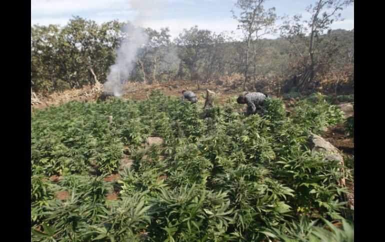 Jalisco | Los municipales destruyeron aproximado nueve mil 600 plantas del enervante Policías de Zapopan localizan dos plantíos de mariguana Los municipales destruyeron aproximado nueve mil 600 plantas del enervante Por: EL INFORMADOR 17 de agosto de 2012 - 11:48 hs Policías municipales destruyen los plantíos para presentar las evidencias y dar parte el Ministerio Público Federal. ARCHIVO / ZAPOPAN, JALISCO (17/AGO/2012).- Por la tarde de este jueves policías de Zapopan localizaron tres plantíos de vegetal verde con las características de la mariguana, destruyendo un aproximado de nueve mil 600 plantas del enervante. Efectivos de Seguridad Pública de Zapopan, en su recorrido de vigilancia por un cerro sin nombre a siete kilómetros al noreste del poblado de Ixcatán, encontraron el primer predio con una extensión aproximada de 20 por 50 metros y un aproximado de cuatro mil plantas, siendo este el más grande. Posteriormente, cercano a este lugar localizaron el segundo con una extensión de 20 por 40 metros y un aproximado de tres mil 200 plantas. Por último y también cercano a estos, localizaron un tercer plantío con una dimensión de alrededor de 20 por 40 y en su interior unas dos mil 400 plantas dando un total de los tres plantíos de nueve mil 600 plantas aproximadamente. Siendo los uniformados quienes aseguran y destruyen los plantíos para presentar las evidencias y dar parte el Ministerio Público Federal para su tramitación correspondiente. Temas Seguridad Decomisos de droga en Jalisco Policía de Zapopan Recibe las últimas noticias en tu e-mail Todo lo que necesitas saber para comenzar tu día Registrarse implica aceptar los Términos y Condiciones