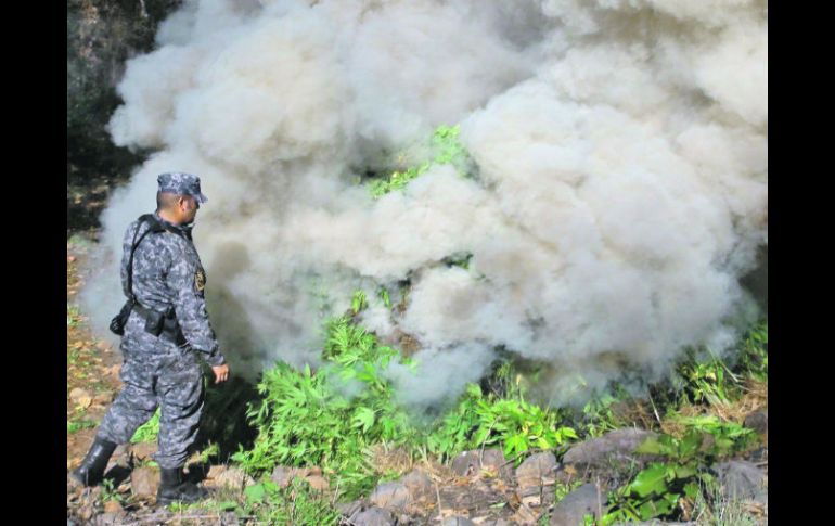 Jalisco | ''Halcón Negro'' ayuda a dar con la siembra Policías estatales destruyen más de 16 mil matas de mariguana Las autoridades encuentran cinco extensiones en Ameca, Tala y Guachinango Por: EL INFORMADOR 17 de marzo de 2012 - 03:04 hs Las autoridades destruyeron alrededor de 16 mil plantas del enervante. ESPECIAL / GUADALAJARA, JALISCO (17/FEB/2012).- Desde tierra era difícil dar con la siembra furtiva de enervante, desde el aire, no tanto. Esto fue lo que demostraron los vuelos de prevención con el recién adquirido helicóptero Black Hawk, que derivaron en la destrucción de cinco plantíos de mariguana. Elementos de la Secretaría de Seguridad Pública del Estado (SSPE) localizaron cinco extensiones (foto) sembradas con mariguana en los municipios de Ameca, Tala y Guachinango, equivalentes a 16 mil 50 plantas del enervante, según estimaciones de la corporación. Temas Seguridad Secretaría de Seguridad Pública de Jalisco Recibe las últimas noticias en tu e-mail Todo lo que necesitas saber para comenzar tu día Registrarse implica aceptar los Términos y Condiciones