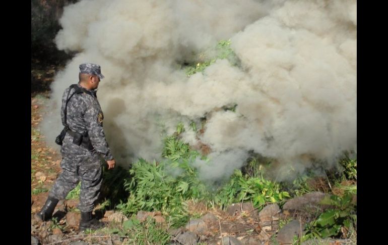 Jalisco | Abarca los municipios de: Ameca, Tala y Guachinango Policías estatales destruyen plantíos de mariguana Se localizaron cinco extensiones sembradas entre las regiones Valles y Sierra Occidental Por: EL INFORMADOR 16 de marzo de 2012 - 16:38 hs Según las autoridades fueron incendiadas 16 mil 50 plantas. ESPECIAL / AMECA, JALISCO (16/MAR/2012).- Cinco plantíos de mariguana que fueron localizados entre las regiones Valles y Sierra Occidental fueron destruidos por elementos de la Secretaría de Seguridad Pública del Estado (SSPE). De acuerdo con información de la dependencia estatal, los vuelos de prevención realizados con el reciente adquirido helicóptero Black Hawk localizaron cinco extensiones sembradas con mariguana en los municipios de: Ameca, Tala y Guachinango. Según las estimaciones de la SSPE fueron incineradas al menos 16 mil 50 plantas del enervante. Se explicó, que dos de los cultivos de la droga, se encontraron en el municipio de Ameca: el primero de 600 metros cuadrados, con un total dos mil 400 plantas y el segundo de 225 metros cuadrados, con un total de 900 plantas; tenían al menos un metro de altura. En el municipio de Tala, fueron descubiertos dos terrenos de mariguana, con un total de cinco mil 250 plantas y otro de 300 metros cuadrados, con un total del mil 500 plantas, ésta también tenía casi un metro de altura. Por otro lado, en la Región Sierra Occidental, en el municipio de Guachinango, detectaron un plantío de mil 500 metros cuadrados, con un total de seis mil plantas, de un metro de altura, aproximadamente. Tras detectar los plantíos más de 40 policías estatales acudieron a los sembradíos en el helicóptero debido al difícil acceso para destruirlos mediante la incineración, con un total de 16 mil 50 plantas de marihuana. Además, un agente del Ministerio Público de la Federación inició con las investigaciones del caso para encontrar a los dueños de los sembradíos. Temas Seguridad Decomisos de droga en Jalisco Secretaría de Seguridad Pública de Jalisco Recibe las últimas noticias en tu e-mail Todo lo que necesitas saber para comenzar tu día Registrarse implica aceptar los Términos y Condiciones