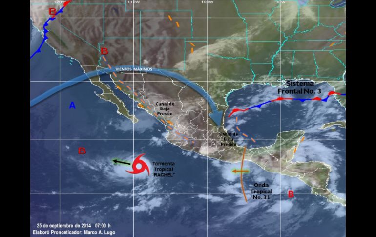 Jalisco | La tormenta, combinada con una zona de inestabilidad, favorecerá el aporte de humedad 'Rachel' provocará lluvias muy fuertes en Jalisco La tormenta, combinada con una zona de inestabilidad, favorecerá el aporte de humedad Por: NTX 25 de septiembre de 2014 - 08:04 hs CIUDAD DE MÉXICO (25/SEP/2014).- La tormenta tropical ''Rachel'' continúa su trayectoria a 20 kilómetros hacia el oeste-noroeste frente a las costas del Pacífico e interactúa con una zona de inestabilidad en el interior del país, lo que genera lluvias importantes. El Servicio Meteorológico Nacional ( SMN) detalló que a las 7:00 horas el fenómeno meteorológico se ubicó aproximadamente a 575 kilómetros al sur-suroeste de Cabo Corrientes, Jalisco, y a 780 kilómetros al sur de Cabo San Lucas, Baja California Sur, con vientos de 65 kilómetros por hora y rachas de hasta 85. Su circulación en combinación con la zona de inestabilidad mencionada favorecerá aporte de humedad que derivará en lluvias muy fuertes en zonas de Jalisco, y fuertes en sitios de Baja California Sur, Colima y Michoacán, así como vientos moderados y oleaje elevado en costas de estas entidades. A su vez, la onda tropical número 31, continuará afectando al sureste, sur y oriente del país, generando lluvias intensas en Chiapas; muy fuertes en Oaxaca, Veracruz y Tabasco, así como fuertes en Guerrero, además de vientos del noreste de hasta 60 kilómetros por hora en el Istmo y Golfo de Tehuantepec. En tanto, un canal de baja presión en el oriente de la Península de Yucatán provocará el incremento de nublados con lluvias muy fuertes en Campeche, y fuertes en Yucatán y Quintana Roo. El Sistema Frontal número 3 en el noreste del Golfo de México genera un canal de baja presión extendido hasta el noreste del país. En interacción con el aire cálido y húmedo el sistema ocasionará lluvias muy fuertes acompañadas de tormentas eléctricas y granizadas en Tamaulipas; fuertes en áreas de Nuevo León, y de menor intensidad en Coahuila y San Luis Potosí. Una zona de inestabilidad afectará el noroeste, occidente y porciones del centro de la República, con lluvias fuertes en Sonora, Sinaloa, Nayarit, Chihuahua, Durango, Estado de México, Hidalgo, Tlaxcala, Puebla, Distrito Federal y Morelos, y menores a 25 milímetros en Zacatecas, Aguascalientes, Guanajuato y Querétaro. Temas Municipios Clima Temporada de lluvias Tormenta tropical Lluvias en el país Lee También Gobierno de Puerto Vallarta entrega apoyos a familias afectadas por las lluvias ¿LLUVIA en GDL por la noche?, pronóstico del clima para hoy, 13 de octubre Temporal de lluvias deja 20 muertos en Jalisco Suben termómetros en Guadalajara y se espanta la lluvia este martes Recibe las últimas noticias en tu e-mail Todo lo que necesitas saber para comenzar tu día Registrarse implica aceptar los Términos y Condiciones