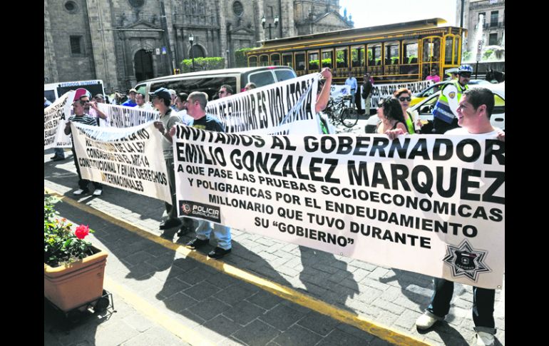 Jalisco | Policías reprobados se manifiestan nuevamente en el Centro Histórico Retan a Emilio a ''certificarse'' Las protestas de los policías estatales y municipales de Jalisco se han repetido desde que comenzaron la reprobación y los despidos de elementos de las corporaciones Por: EL INFORMADOR 22 de febrero de 2013 - 03:11 hs Los manifestantes exhibieron mantas en las que desafiaron el gobernador, Emilio González, a aplicar las pruebas de control de confianza EL INFORMADOR / GUADALAJARA, JALISCO (22/FEB/2013).- Policías que resultaron reprobados en los procesos de control de confianza que deben aplicar todas las corporaciones de seguridad del país organizaron ayer una manifestación en el Centro, con mantas en las que desafiaron al gobernador Emilio González Márquez a que se aplique y apruebe las pruebas que contiene este modelo. Las protestas de los policías estatales y municipales de Jalisco se han repetido desde que comenzaron la reprobación y los despidos de elementos de las corporaciones. Temas Seguridad Manifestaciones en Jalisco Emilio González Certificación policial Recibe las últimas noticias en tu e-mail Todo lo que necesitas saber para comenzar tu día Registrarse implica aceptar los Términos y Condiciones