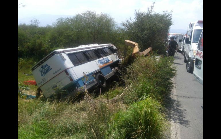 Jalisco | El autobús que transportaba a La Tropa Chicana se accidenta en carretera a Teocuitatlán Se accidenta camión de grupo musical; mueren tres personas El autobús que transportaba a La Tropa sufre un percance por la carretera libre a Teocuitatlán Por: EL INFORMADOR 9 de abril de 2015 - 16:35 hs El transporte terminó su marcha a un costado de la carretera. ESPECIAL / GUADALAJARA, JALISCO (09/ABR/2015).- El autobús de los integrantes del grupo musical La Tropa Chicana sufrió un accidente la tarde de este jueves en mientras circulaba por la carretera libre a Teocuitatlán, lo que dejó al menos tres personas muertas, según informes preliminares de la Unidad Estatal de Protección Civil y Bomberos (UEPCB). El percance ocurrió alrededor de las 14:30 horas. Rescatistas se dirigieron tras reportes del hecho al kilómetro 7 de la carretera libre a Teocuitatlán, en el sentido hacia Guadalajara. Al parecer, el accidente ocurrió porque reventó uno de los neumáticos delanteros del vehículo, lo que provocó que se fuera hacia las barreras de contención del sentido contrario, las cuales se incrustaron en el frente del camión hasta destrozarle el lado derecho. El transporte terminó su marcha a un costado de la carretera. Se solicitó el apoyo de distintas corporaciones de servicios médicos y de rescate. Se encontraron tres personas fallecidas, el chofer y dos integrantes del grupo oriundo del municipio de La Barca, cuyos nombres no han sido proporcionados; 11 personas más resultaron con lesiones y trasladados a puestos de socorros. Temas Seguridad Accidentes con muertes en Jalisco Protección Civil Jalisco Carreteras de Jalisco Lee También Helicóptero se desploma en Huntington Beach, California; reportan cinco heridos Tres personas resultan lesionadas tras explosión de camión en carretera México-Puebla Recuperan camión de carga robado en Tlajomulco Denuncia en su contra es para ocultar un fraude: Hermana de Omar "N" Recibe las últimas noticias en tu e-mail Todo lo que necesitas saber para comenzar tu día Registrarse implica aceptar los Términos y Condiciones