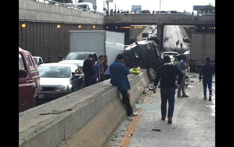 GUADALAJARA, JALISCO (26/JUL/2017).- Alrededor de 10 vehículos participaron en un choque la tarde de este miércoles sobre carretera a Nogales a la altura del paso a desnivel que está cerca de avenida Aviación, en Zapopan.Protección Civil del municipio informó que un tráiler que habría sufrido una falla mecánica impactó a los automóviles, lo que provocó la carambola; cuatro personas resultaron con lesiones, mismas que ya fueron trasladadas para recibir atención médica.El accidente provocó un caos vial en la zona, ya que se cerraron los carriles centrales de dicha vialidad.