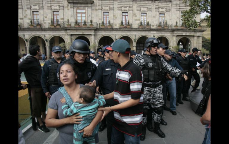 Jalisco | La gresca deja como saldo cinco detenidos y nueve personas heridas Se registra enfrentamiento entre Policía tapatía y ambulantes La gresca deja como saldo cinco detenidos y nueve personas heridas, seis policías y tres inspectores Por: EL INFORMADOR 3 de diciembre de 2015 - 14:37 hs En este momento la situación está bajo control gracias a la incorporación de más uniformados y antimotines. EL INFORMADOR / R. Tamayo GUADALAJARA, JALISCO (03/DIC/2015).- Un grupo de comerciantes ambulantes agredió hoy alrededor de las dos y media de la tarde a policías tapatíos e inspectores afuera del Ayuntamiento de Guadalajara. Todo comenzó cuando tres inspectores fueron agredidos a golpes en Colón y Pedro Moreno, en el Centro Histórico, al tratar de impedir que se instalaran informales. Posteriormente fueron correteados hasta el edificio del Ayuntamiento de Guadalajara, en donde se registró otro conato de bronca con el lanzamiento de botellazos por parte de los ambulantes. En este momento la situación está bajo control gracias a la incorporación de más uniformados y antimotines. El Ayuntamiento de Guadalajara informó que tras el enfrentamiento varios elementos resultaron heridos, entre ellos seis policías y tres inspectores; hay cinco personas detenidas. Los comerciantes ambulantes denuncian que los policías golpearon a una mujer embarazada durante el enfrentamiento y piden la liberación de sus compañeros. Temas Seguridad Policía de Guadalajara Comercio ambulante Salvador Caro Cabrera Lee También Clima en Guadalajara hoy: el pronóstico para el martes 14 de octubre de 2025 ¿LLUVIA en GDL por la noche?, pronóstico del clima para hoy, 13 de octubre Suben termómetros en Guadalajara y se espanta la lluvia este martes Analizan modelo de transporte público para avenida López Mateos Recibe las últimas noticias en tu e-mail Todo lo que necesitas saber para comenzar tu día Registrarse implica aceptar los Términos y Condiciones