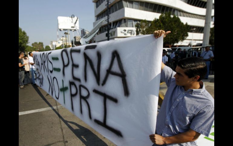 Jalisco | Los jóvenes portan mantas con señalamientos en contra de Aristóteles y Alfaro Se suman más del #YoSoy132 en área de debate Los jóvenes portan mantas con señalamientos en contra de los candidato, el priista Jorge Aristóteles Sandoval y Enrique Alfaro, abanderado de Movimiento Ciudadano Por: EL INFORMADOR 10 de junio de 2012 - 11:09 hs Manifestaciones registradas a las afueras del debate. / GUADALAJARA, JALISCO (10/JUN/2012).- Más integrantes del grupo #YoSoy132 acuden a la sede del debate. Se presenta una decena de jóvenes que portan tres mantas azules en las que se hacen señalamientos contra el candidato priista Jorge Aristóteles Sandoval y Enrique Alfaro, abanderado de Movimiento Ciudadano. "Alfaro te aliaste con Televisa. No a la manipulación"."Aris igual a Peña. No represión".No se presentan incidentes hasta el momento. EL INFORMADOR / LETICIA FONSECA Temas Debates políticos Elecciones Jalisco 2012 #YoSoy132 Recibe las últimas noticias en tu e-mail Todo lo que necesitas saber para comenzar tu día Registrarse implica aceptar los Términos y Condiciones