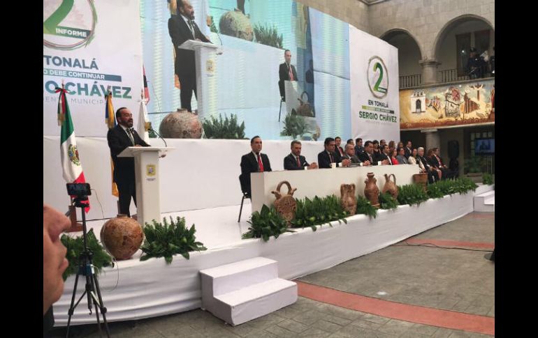 GUADALAJARA, JALISCO (11/SEP/2017).- El presidente municipal de Tonalá, Sergio Chávez Dávalos, rindió este lunes su Segundo Informe de Gobierno, en el cual resaltó la inversión en obra pública como uno de los grandes aciertos en el último año de su gestión.Con la presencia del Gobernador del Estado, Aristóteles Sandoval Díaz, el alcalde informó que en el último año se invirtieron 425 millones de pesos en diferentes obras, tales como pavimentación en diferentes calles y la rehabilitación de la avenida Tonalá, entre otras.Destaca la construcción de un canal pluvial en la colonia Loma Bonita, donde hace un par de meses se vivió una grave inundación, en la que muchos ciudadanos perdieron sus pertenencias.“Desde que yo recuerdo, un chubasco, una tormenta en la parte Norte, y Loma Bonita se inunda, y este año no fue la excepción, ahí estuvimos con los bomberos atendiendo a esa gente… hoy se construye ese colector de 1.5 kilómetros que tenía más de 30 años que nadie hacía nada”.En la colonia Jalisco se intervinieron más de 100 cuadras, además de que se renovó la unidad deportiva Ignacio Zaragoza, en conjunto con los gobiernos estatal y federal.Ahí, comentó Sandoval Díaz, se han realizado 62 acciones en diferentes rubros, sobre todo en seguridad.En cuanto a infraestructura en salud, se construyeron dos nuevas Cruz Verde, una en la zona Sur, en la colonia La Jauja, recientemente inaugurada y donde ya nacieron cuatro bebés.La segunda es la Cruz Verde Norte, en la colonia Jalisco, donde todavía se requieren cinco millones de pesos para continuar con la segunda etapa de construcción, la cual está contemplada para quedar terminada a finales de enero del 2018.“El pasado viernes entregamos la primera etapa de la Cruz Norte para la colonia Jalisco, Zalatitán, Alamedas, Basilio Vadillo, Loma Bonita, San Gaspar y Urbiquinta; ya está ahí mi promesa cumplida, ya hay doctores, enfermeras y personal médico de las 08:00 a las 20:00 horas”.En cuestión de seguridad, se capacitó a 113 policías nuevos, se compraron 18 nuevas patrullas y se comenzó la instalación de 330 cámaras de videovigilancia.Chávez Dávalos aseguró que esto ha permitido que Tonalá sea el municipio con más baja incidencia delictiva de la Zona Metropolitana de Guadalajara.Rezago en transparencia y pago de predialEl alcalde reconoció que a pesar de los avances que se han tenido en el pago puntual de nóminas y en el compromiso de no contratar deuda, el municipio todavía arrastra un rezago en el tema de transparencia.“No estoy yo contento al 100%, ha habido avances importantes en estos dos años, pero hace falta pulir, hace falta emigrar más a la cultura de la transparencia, para que la gente nos tenga más confianza a los gobiernos municipales”.Por otro lado, lamentó que se lleve poco avance en el pago del impuesto predial de parte de los ciudadanos.Según el último corte del mes de septiembre, se han pagado sólo 100 mil de las 186 mil cuentas de los ciudadanos.“Amigas y amigos, hay que jalar parejo, la invitación respetuosa es a los que no han pagado su impuesto predial, para poder cerrar este año de una manera como la tenemos proyectada; sí les doy una garantía, que cada peso que entra a las arcas, se les estará informando dónde se aplica”.El datoDe acuerdo con el propio Sergio Chávez Dávalos la realización de su Segundo Informe de Gobierno tuvo un costo de 377 mil pesos.EL INFORMADOR / THAMARA VILLASEÑOR