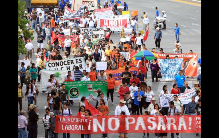 Jalisco | Esperan que diputados locales mañana se pronuncien en contra Sindicatos de Jalisco continuarán su lucha contra reforma laboral Esperan que diputados locales se pronuncien en contra; se prevé que mañana el pleno de la Cámara de Diputados de luz verde a la reforma Por: EL INFORMADOR 26 de septiembre de 2012 - 20:16 hs El contingente gritaba consignas como ''Reforma alevosa la de Calderón Hinojosa''. / GUADALAJARA, JALISCO (26/SEP/2012).- Con una marcha y bloqueos a la circulación en céntricas calles de Guadalajara, integrantes de alrededor de 80 sindicatos del Frente Jalisco Contra la Reforma Laboral, protestaron contra la "leonina", la "esclavizadora" reforma laboral que ya fue aprobada en comisiones por legisladores federales. Ante la luz verde que se prevé dará el pleno de la Cámara de Diputados al dictamen mañana jueves, el representante de la Federación General de trabajadores del Estado y sus Municipios, Cuauhtémoc Peña Cortés, anunció que realizarán un paro nacional, estarían por definir la fecha. Los manifestantes advitieron que no descansarán en sus acciones de oposición a los cambios a la Ley del Trabajo, esta noche realizarán una velada en Plaza de la Liberación con la participación de un pequeño grupo; mañana harán una sesión plenaria y esperarán a conocer la respuesta de los diputados locales a quien solicitan se pronuncien en contra de la reforma laboral. "Vamos a permanecer y lo más importante es que si esto continúa, esto tan catastrófico, vamos a hacer una manifestación mañana, pasado... Estamos poniéndonos de acuerdo en que vamos a hacer paros la laborales no nada más en el gobierno, también en las empresas privadas, estamos acercándonos a ellos", mencionó por su parte Rosario Prado Macías del Sindicato de Guadalajara. La marcha Con el grito de: Rechazo total a la reforma laboral! Inició a avanzar el contingente del Frente Jalisco Contra la Reforma Laboral en la Glorieta de La Normal hacia Congreso del Estado. Una hora duró el recorrido que comenzó a las 17:00 horas. Los marchistas llegaron a Plaza de la Liberación, donde un grupo permanecerá durante la noche para continuar con sus protestas por los cambios "leoninos" que se cocinan a la legislación laboral por parte de legisladores federales. Las protestas se prolongaron tras llegar los manifestantes al Congreso y no permitirles el ingreso a una comisión de 10 líderes sindicales, quienes pedían entregar al menos a un diputado un documento. Les informaron que no había ningún legislador en el recinto; luego, les cerraron la puerta. Los manifestantes reaccionaron bloqueando durante alrededor de 20 minutos el transitado cruce de Alcalde e Hidalgo, afectando notoriamente la circulación. El crucero fue reabierto tras el acuerdo de que entregaría el documento a la Oficialía de Partes del Congreso, una Comisión de cinco líderes sindicales. En el escrito firmado por representantes de los trabajadores, el frente pide al Legislativo local se manifieste en contra del intento de afectar a la clase trabajadora con la reforma laboral, y fije su postura ante la Cámara de Diputados. Durante el recorrido por Alcalde, el contingente conformado por cuatro mil personas, según los organizadores y 500 de acuerdo a estimaciones de autoridades viales, ocupó los tres carriles de la avenida (sentido Norte-Sur) provocando conflictos vehiculares. Los inconformes portaron diversas mantas y lanzaron continuamente consignas en contra de la pretendida reforma laboral que se analiza. ''Reforma alevosa la de Calderón Hinojosa'', ''Pueblo, escucha, también ésta es tu lucha'' y ''Aplaudan, aplaudan no dejen de aplaudir, que el pin... gobierno nos tiene que oír'', gritaban al unísono centenares de gargantas. Además del contingente que partió de La Normal, otro grupo avanzó procedente de Plaza Juárez hacia Plaza de la Liberación. Además del grupo mayoritario de manifestantes que prevaleció durante alrededor de dos horas frente al Congreso (se retiraron aproximadamente a las 20:00 horas), otro contingente donde había integrantes de #YoSoy132, permanecieron en la parte trasera de Palacio Legislativo. También estuvo impedido el tránsito por la calle Independencia. Para SaberAlgunas razones por las que se rechaza la reforma laboral: -Reduce la estabilidad en el empleo. -Facilita los despidos. -No permite generar antigüedad. -Impone el pago por hora base con un salario de 7.5 pesos la hora, sin prestaciones. -Anula el derecho a huelga. -Limita el pago de salarios caídos a un máximo de 12 meses cuando los juicios se alarguen. -Legaliza la subcontratación (outsourcing). -Legaliza la polivalencia (el multiusos) con el mismo salario. EL INFORMADOR / LETICIA FONSECA Temas Manifestaciones en Jalisco Municipios Reforma Laboral Sindicatos Recibe las últimas noticias en tu e-mail Todo lo que necesitas saber para comenzar tu día Registrarse implica aceptar los Términos y Condiciones