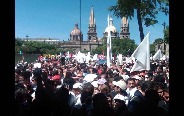 Jalisco | La caminata desde Rectoría hasta el Centro fue de alrededor de 30 minutos Sufren líderes universitarios para llegar al templete en Plaza Liberación El rector de la UdeG y el presidente de la FIL pasaron una odisea para poder abrirse paso entre los miles de estudiantes que se aglomeran Por: EL INFORMADOR 29 de septiembre de 2010 - 11:33 hs Aspecto de la comunidad universitaria en Plaza Liberación. R. ZAPATA / GUADALAJARA, JALISCO (29/SEP/20109.- Toda una odisea tuvieron que pasar los líderes de la Universidad de Guadalajara para poder subir al templete instalado al frente del Teatro Degollado en Plaza Liberación. El contingente encabezado por el rector de la Universidad, Marco Antonio Cortés Guardado, el ex rector, Raúl Padilla López, su hermano Trinidad, el escritor Fernando del Paso, alcaldes priistas, legisladores, líderes sindicales e invitados especiales, tuvo que sortear empujones para abrirse paso entre la comunidad universitaria reunida en la Plaza Liberación. Y es que, a pesar de las dimensiones del contingente que partió de la Rectoría rumbo al centro de la ciudad, se decidió ingresar a la Plaza de la Liberación por un costado, y justo en el punto donde las jardineras localizadas en el perímetro de la plancha hacen angosto el acceso al lugar. Notorio fue el esfuerzo hecho el rector de la Universidad, el presidente de la Feria Internacional del Libro y todos sus acompañantes, y quienes en un cerco delineado por una soga, caminaron entre la multitud de estudiantes que ya se encontraban reunidos en la Plaza para poder llegar y acceder al templete que fue instalado al pie del Teatro Degollado. Los integrantes del grupo llegaron empapados en sudor después de la accidentada caminata entre la gente. EL INFORMADOR / RAFAEL ZAPATA Temas Gobierno del Estado UdeG Raúl Padilla Presupuesto UdeG Recibe las últimas noticias en tu e-mail Todo lo que necesitas saber para comenzar tu día Registrarse implica aceptar los Términos y Condiciones