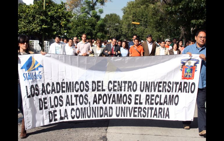 Jalisco | Conflicto con el Gobierno estatal Suman 30 manifestaciones de la UdeG para exigir más recursos Estudiantes del Centro Universitario de Los Altos continuaron con las demandas de la casa de estudios Por: EL INFORMADOR 26 de octubre de 2010 - 05:05 hs Maestros y estudiantes del CUAltos marchan sobre Avenida Manuel Acuña rumbo a Casa Jalisco. J. VENTURA / GUADALAJARA, JALISCO (26/OCT/2010).- La Universidad de Guadalajara ( UdeG) llegó ayer a 30 manifestaciones que han sido realizadas en un lapso de 57 días. De éstas, 27 movilizaciones han tenido como destino final Casa Jalisco, dos más el Palacio de Gobierno y la megamarcha del pasado miércoles 29 de septiembre, cuyo lugar de concentración fue la Plaza de la Liberación. El propósito: exigir al titular del Ejecutivo, Emilio González Márquez, la entrega de los 701 millones de pesos (MDP) comprometidos sucesivamente ante la Federación desde 2007, así como los 520 millones de pesos de la ampliación presupuestal solicitada a principios de año. La mañana de ayer tocó el turno a cerca de 350 estudiantes y profesores del Centro Universitario de Los Altos (CUAltos) escuchar una conferencia sobre los animales venenosos de la región Altos Sur, observar una exhibición de taekwondo y ser partícipes del baile de una vaca gigante con armazón de aluminio, hecha por los alumnos del plantel como signo de una las actividades de la zona que es la producción de leche. La rectora del CUAltos, María Esther Avelar Álvarez, señaló que el Centro Universitario que preside tienen necesidades por alrededor de 150 MDP. En el CUAltos, precisó, es necesaria la construcción de ocho laboratorios, un edificio de 14 aulas, una sala de juicios orales y de un complejo deportivo. Dijo que también falta la conclusión de la segunda etapa, tanto de la clínica para pequeñas especies, como del invernadero del campus. En las puertas de Casa Jalisco los estudiantes dejaron mermelada de fresa, verdura en escabeche, un panqué de vainilla acompañado de varios panqués más pequeños, todos estos productos elaborados por estudiantes de dicho Centro Universitario. PARA SABER Hoy se llevará a cabo la movilización número 31 de la UdeG, y tocará el turno a los estudiantes de la Preparatoria Regional de Ameca. Temas Gobierno del Estado UdeG Emilio González Presupuesto UdeG Recibe las últimas noticias en tu e-mail Todo lo que necesitas saber para comenzar tu día Registrarse implica aceptar los Términos y Condiciones