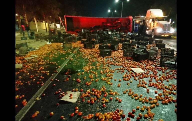GUADALAJARA, JALISCO (18/ABR/2017).- La volcadura de un tractocamión cargado con jitomate se registró la madrugada de este martes en la colonia Las Fuentes, en Zapopan.La Unidad de protección Civil y Bomberos de Zapopan informaron del percance ocurrido en el cruce de Periférico sur y la avenida López Mateos donde el tractocamión cargado con cerca de 12 toneladas de jitomate volcó sobre dos de los carriles del Periférico Sur.Al parecer, el conductor del vehículo pesado intentó maniobrar para no impactar a otro vehículo cercano, sin embargo perdió el control del volante y terminó volcado sobre su costado derecho.En el lugar no se reportaron personas lesionadas.La zona del incidente fue objeto de rapiña por parte de vecinos quienes aprovecharon la situación para recolectar el producto.Los jitomates quedaron esparcidos sobre el asfalto en un área de 200 por 20 metros aproximadamente; bomberos municipales se encargaron de la limpieza de la zona para evitar que se registrara otro incidente, finalizó la corporación.