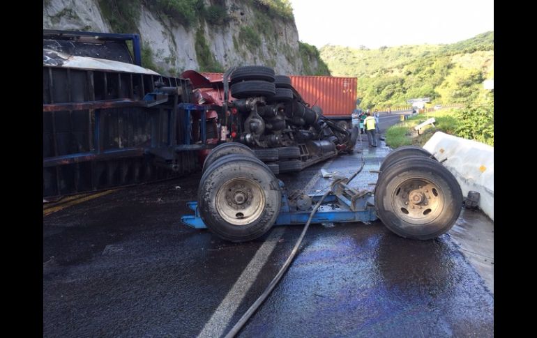 Jalisco | El accidente provoca el indencio de la unidad, más no se reportan heridos Tráiler vuelca en carretera a Colima El accidente provoca el indencio de la unidad, más no se reportan heridos Por: NTX 22 de agosto de 2015 - 10:46 hs Las autoridades se encuentran en labores de limpieza y en proceso de retirar los escombros. ESPECIAL / Protección Civil GUADALAJARA, JALISCO (22/AGO/2015).- Un tráiler volcó y se incendió la mañana de este sábado sobre la carretera Guadalajara-Colima, hecho que no dejó personas lesionadas, informó la Unidad Estatal de Protección Civil. El incidente ocurrió hacia las nueve de la mañana, a la altura del lugar conocido como los Cuatro Caminos, aproximadamente en el kilómetro 103. Personal de rescate acudió al lugar donde se hallaba un tráiler volcado, el cual se había incendiado. Los bomberos procedieron a sofocar el incendio. El hecho no dejó personas lesionadas. Actualmente se procede a labores de limpieza y con maniobras para el retiro del automotor. Temas Seguridad Accidentes Carreteras de Jalisco Colima Lee También Cartucho Astros de Jalisco toma ventaja sobre Xalapa en la semifinal de zona Detienen a presunto homicida en Lomas de Oblatos Puerto Vallarta es reconocida como la mejor ciudad pequeña de Latinoamérica Recibe las últimas noticias en tu e-mail Todo lo que necesitas saber para comenzar tu día Registrarse implica aceptar los Términos y Condiciones