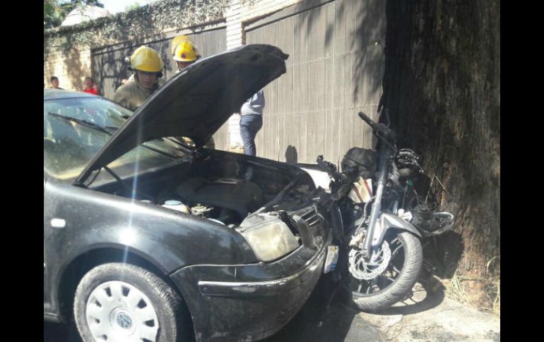 GUADALAJARA, JALISCO (10/FEB/2017).- Un auto y una motocicleta se incendiaron luego de un choque en la colonia Lomas del Valle en Zapopan.Juan Andrés Reynaga, subcomandante de Bomberos de Zapopan, informó que un vehículo Jetta negro y una motocicleta colisionaron en las calles Bajada del Águila y Naciones Unidas. Luego de este percance la moto comenzó a quemarse y las llamas llegaron hasta una parte del auto; según el reporte, la motocicleta fue totalmente consumida por las llamas mientras que el coche sólo sufrió algunos daños.Uno de los vecinos del lugar consiguió apagar el fuego momentos antes de que llegaran los bomberos al lugar. A su arribo las autoridades confirmaron que el fuego estuviera completamente sofocado y que no hubiera derrames de combustible en el sitio.Tanto el conductor del Jetta como el de la motocicleta se dieron a la fuga y hasta el momento no hay información sobre ellos.