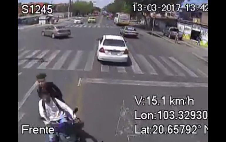 GUADALAJARA, JALISCO (14/MAR/2017).- Una unidad del transporte público captó en video el momento en el que una motocicleta con dos tripulantes se impacta contra ésta, en Guadalajara.El pasado lunes 13 de marzo, un camión se encontraba detenido en el boulevard Marcelino García Barragán. Cuando el semáforo cambió y el transporte se disponía a dar vuelta a la izquierda para enfilar hacia Salvador López Chávez, una moto que daba vuelta desde esa calle invadió el carril y chocó contra la unidad.La cámara frontal del camión registró el momento del accidente, video en el que se aprecia que ni el conductor ni el otro tripulante de la motocicleta llevaban casco o chaleco.El video ha sido difundido en redes sociales y ya suma miles de reproducciones. Sin embargo, no se reveló ni la ruta del camión ni el estado de salud de los motociclistas.