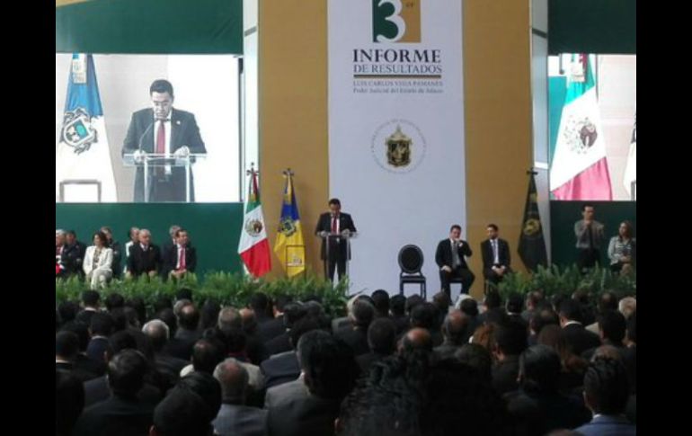 Jalisco | El presidente del Supremo Tribunal de Justicia de Jalisco rinde su tercer informe Vega Pámanes destaca avances en materia judicial El presidente del Supremo Tribunal de Justicia de Jalisco rinde su tercer informe de actividades este viernes Por: EL INFORMADOR 11 de diciembre de 2015 - 14:44 hs En el Palacio de Justicia, Vega asevera que su gestión se caracteriza, entre otras, por su cero tolerancia a la corrupción. TWITTER / @supremotribjal GUADALAJARA, JALISCO (11/DIC/2015).- "Desde el Poder Judicial hemos contribuido no sólo con un grano de arena, sino con todo un bloque de ladrillos, para alcanzar los primeros lugares que Jalisco merece en materia de administración de justicia", fueron palabras del presidente del Supremo Tribunal de Justicia del Estado, Luis Carlos Vega Pámanes, al rendir su tercer informe de actividades este viernes, donde se destacó la modernización con la compra de computadoras, la construcción de tres salas de juicios orales de segunda instancia y la impartición de maestrías y doctorados. Decenas de sillas transparentes fueron dispuestas en el patio del Palacio de Justicia que se atestaron de jueces, magistrados, funcionarios y demás, frente a un podio lleno de más magistrados; y al centro, los representantes de los poderes Judicial, Ejecutivo y Legislativo, Luis Carlos Vega, Aristóteles Sandoval y Enrique Aubry, respectivamente. Tras la llegada de los asistentes comenzaron los honores a la bandera y la entonación de los himnos Mexicano y de Jalisco, seguido de la lectura de una larga lista de asistentes. Posterior a ello, en dos pantallas montadas a ambos lados del frente, pasó un video de unos 20 minutos de duración que versó sobre las novedades del Poder Judicial en los pasados tres años, desde que Vega asumió la presidencia. Del video, destacó la entrada en vigor de los juicios orales en Jalisco con las salas inauguradas en Ciudad Guzmán, Puerto Vallarta, Tepatitlán y Lagos de Moreno, las cuales han llevado ya en conjunto 223 causas de las que 55 han tenido ya soluciones alternas y 21 terminación anticipada, que representan alrededor de 38% de causas terminadas en poco más de un año, a comparación que si se hubieran tratado con el anterior sistema, que acaso no hubiera representado conclusión para ningún caso pues lleva al menos dos años de conclusión para cada asunto. También se resaltó la impartición de maestrías en sistema acusatorio adversarial y derecho judicial, además de doctorados en derecho y en medios alternos de solución de conflictos, que suman ya 197 alumnos entre egresados y los que aún cursan. Incluso de ellos, 40 egresados son ya o se preparan para los cargos de jueces en justicia oral. En su discurso, Vega aseveró que su gestión se caracteriza, entre otras, por su cero tolerancia a la corrupción, prueba de ello las sanciones a 40 jueces y destituciones a 10 de ellos. También aprovechó para promover los avances en justicia mercantil que atraerán más inversiones a la entidad y para advertir que, con mil 50 casos atraídos por cada juzgador, están sobrecargados de trabajo, con lo que dejó entrever que el Poder Judicial requiere de más recursos. EL INFORMADOR / SERGIO BLANCO Temas Gobierno del Estado Supremo Tribunal de Justicia del Estado Recibe las últimas noticias en tu e-mail Todo lo que necesitas saber para comenzar tu día Registrarse implica aceptar los Términos y Condiciones