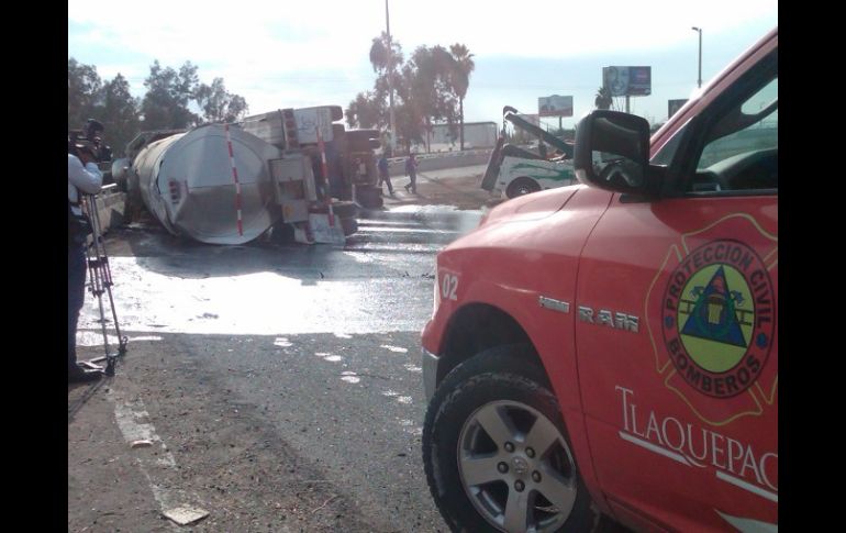 Jalisco | Se soltó el remolque de un tractocamión que transportaba 30 mil litros de maíz Vuelca pipa en Carretera a Chapala Se soltó el remolque de un tractocamión que transportaba 30 mil litros de maíz Por: EL INFORMADOR 11 de diciembre de 2012 - 21:05 hs Parte de los 30 mil litros se derramó en el lugar. / TLAQUEPAQUE, JALISCO (11/DIC/2012).- Una pipa cargada con 30 mil litros de aceite de maíz se volcó en San Pedro Tlaquepaque. El percance ocurrió sobre la Carretera a Chapala, a su cruce con el Anillo Periférico, sobre el nodo vial que conduce hacia San Martín de las Flores. El tractocamión que transportaba 30 mil litros de aceite de maíz volcó luego que se le zafara el remolque de la pipa y a su vez con el peso de la carga lo colisionara. No hubo personas muertas ni lesionadas. La carga habría salido de la Colonia de El Fresno, en Guadalajara, y sería llevada al Estado de México. Parte de los 30 mil litros se derramó en el lugar; personal de la empresa afectada acudió hasta el sitio para realizar el trasvase del aceite. En la zona se registró carga vehicular durante hora y media. Temas Vialidad Carreteras de Jalisco Lee También Cartucho Astros de Jalisco toma ventaja sobre Xalapa en la semifinal de zona Detienen a presunto homicida en Lomas de Oblatos Puerto Vallarta es reconocida como la mejor ciudad pequeña de Latinoamérica Recibe las últimas noticias en tu e-mail Todo lo que necesitas saber para comenzar tu día Registrarse implica aceptar los Términos y Condiciones