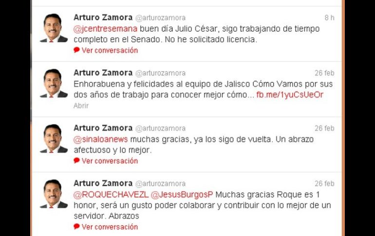 Jalisco | Fuentes del CEN señalan que ocupará la Secretaría General de Gobierno de Jalisco Zamora Jiménez aclara que no ha solicitado licencia El senador federal señala que aún no ha pedido licencia; información del CEN afirma que asumirá el cargo Por: EL INFORMADOR 27 de febrero de 2013 - 16:52 hs En su cuenta de twitter, el ex alcalde de Zapopan respondió a pregunta expresa: Sigo trabajando de tiempo completo en el Senado. ESPECIAL / GUADALAJARA, JALISCO (27/FEB/2013).- Luego de difundirse la versión que lo nombra como integrante de la Secretaría General de Gobierno del gabinete estatal de Aristóteles Sandoval Díaz, el senador jalisciense Arturo Zamora Jiménez señaló hoy a mediodía que no ha solicitado licencia a su cargo. En su cuenta de twitter, el ex alcalde de Zapopan respondió a pregunta expresa: "Sigo trabajando de tiempo completo en el Senado". Sin embargo, un comunicado de prensa del PRI Sinaloa informó este martes que, de acuerdo con información proporcionada por el Comité Ejecutivo Nacional del partido, la presentación del senador como delegado en Sinaloa, que se tenía prevista para este miércoles, fue cancelada "en virtud de que el senador Zamora solicitará licencia al cargo de Senador de la República". Lo anterior, debido a que "asumirá la titularidad de la Secretaría General de Gobierno del Estado de Jalisco a invitación expresa del gobernador electo de ese estado, Aristóteles Sandoval Díaz". En esta circunstancia "también se releva al Senador Zamora de su encomienda como Delegado General del CEN en Sinaloa, por lo que en su oportunidad les convocaremos a la presentación de la persona que se tenga a bien designar a este cargo", informa el PRI sinaloense. A pocas horas de que se den a conocer los nombres de los miembros del equipo de Sandoval Díaz, en las redes sociales y en programas radiofónicos se continúa especulando sobre los posibles secretarios estatales que entrarán en funciones el próximo viernes 1 de marzo. Temas Gobierno del Estado Arturo Zamora Aristóteles Sandoval Lee También Reformas a Ley de Amparo no limita derechos ciudadanos Un país donde la salud mental no existe en el presupuesto México reacciona a acuerdo de paz entre Israel y Hamás "La Mañanera" de Sheinbaum de hoy viernes 10 de octubre de 2025 Recibe las últimas noticias en tu e-mail Todo lo que necesitas saber para comenzar tu día Registrarse implica aceptar los Términos y Condiciones