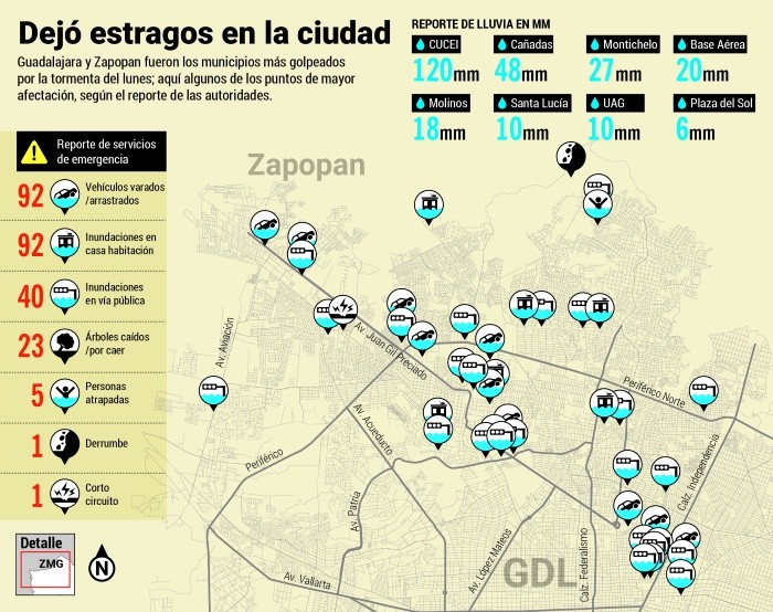 La tormenta de antier fue la más intensa en los últimos 39 años, según datos de la Comisión Nacional del Agua (Conagua), y provocó la primera muerte del temporal en la metrópoli.La víctima es un hombre de 35 a 40 años, identificado de manera preliminar como “Manuel”, quien perdió la vida luego del derrumbe de su vivienda en la Mesa de los Ocotes, en Zapopan.De acuerdo con el reporte emitido por la dependencia federal, en la ciudad cayeron 158 litros de agua por metro cuadrado (por arriba de 75 se considera una lluvia extraordinaria).El récord anterior se documentó el 27 de julio de 1983, cuando llegaron 114.Una mujer resultó con lesiones tras la caída de un árbol y se rescató a cinco personas.Además, 52 fincas tuvieron afectaciones por inundación o entrada de agua en Guadalajara y 92 autos quedaron varados.Este medio publicó que la corriente arrastró coches en la zona del Centro Médico del Instituto Mexicano del Seguro Social (IMSS), Alcalde Barranquitas, El Retiro, La Perla y en cruces como Revolución y la Calle 40.Otros puntos de Guadalajara con anegaciones fueron Circunvalación y Félix Palavicini, Juan Álvarez y Pípila, Salvador Quevedo y Manuel Doblado, Manuel Doblado e Industria, Brillante y Angulo, Balbino Dávalos y Angulo, y Normalistas y Amado Aguirre.Ante esta situación, el Gobierno de Guadalajara solicitará el apoyo del Fondo Estatal de Desastres Naturales.El alcalde Pablo Lemus explicó que buscarán ampliar la bolsa de 10 millones que tiene el municipio para ayudar a las personas cuyas casas se dañaron.Lemus recorrió las colonias Villas de San Juan, Independencia y Analco, donde prometió a los vecinos apoyos para recuperar sus propiedades.La colocación de una barda para delimitar un terreno colindante al canal de Normalistas habría contribuido a que 12 casas de las colonias Independencia y Villas de San Juan se hayan inundado con la tormenta del lunes pasado; coincidieron vecinos y autoridades municipales.América Mejía Hernández, vecina de la privada Cotopaxi, platicó que en su casa el agua subió más de un metro y dañó casi todos sus muebles, desde la televisión, hasta sillones y colchones. Comentó que el agua subió rápido y como la lluvia fuerte duró más de dos horas, no pudieron rescatar sus enseres.“El motivo fue la barda que pusieron, yo tengo tres años aquí y mis suegros más de 20 y nunca había subido tanto el agua. Todo se nos mojó y es pérdida; la tele, los sillones; todo se nos echó a perder. Duramos más de cuatro horas sacando agua, casi ni pudimos dormir”, explicó.La señora Angélica Pérez platicó que el dueño del terreno vecino retiró una malla ciclónica y construyó una barda lo que habría frenado los escurrimientos de agua y anegado las viviendas. La vecina detalló que en su casa el agua entró y subió un metro. Relató que perdieron varios kilos de carne y verdura que tenían pues tienen una cenaduría y un puesto de tacos.“Nos tumbó el refrigerador y los muebles andaban nadando y todo. Otros años había pasado, pero como hicieron esa barda se puso peor y subió más rápido”, comentó.Luego de realizar un recorrido en la zona, el presidente municipal, Pablo Lemus Navarro, instruyó a personal de obras públicas a derribar la barda que dijo fue construida sin los permisos. El edil informó que se clausuró el terreno y multarán al propietario. El Pleno del Ayuntamiento de Guadalajara aprobó por unanimidad la iniciativa de Pablo Lemus Navarro, alcalde tapatío, para que el Consejo Municipal de Emergencia emita la Declaratoria de Emergencia en la capital de la entidad, con el fin de acceder al Fondo Estatal de Desastres Naturales (FOEDEN) del Gobierno de Jalisco.Esta acción tiene como objetivo apoyar a los tapatíos que resultaron afectados tras la lluvia nocturna del lunes 13 de junio.A través de este decreto también se instruye a las dependencias municipales a realizar las acciones de emergencia necesarias para el restablecimiento de la normalidad en las zonas afectadas, tales como limpieza, saneamiento de casas y vialidades, refugio y alimento temporal, entre otras.“Con este fondo de emergencia podríamos acceder a que el 80% del menaje que se restituya a estas familias sea pagado por el Gobierno del Estado de Jalisco y el 20% por el Gobierno Municipal. El asunto es que tenemos que actuar con mucha urgencia, sobre todo por lo que están viviendo estas familias”.“Lo que nos urge es solicitar este apoyo al Gobierno del Estado para poder acceder al fondo de emergencia y en un plazo máximo de dos semanas estas familias puedan tener la restitución de su horno, refrigerador, sala, según sea el caso”, afirmó Lemus Navarro.El gobierno municipal de Guadalajara solicitará el apoyo del Fondo Estatal de Desastres Naturales, informó el alcalde Pablo Lemus Navarro, explicó que buscarán ampliar la bolsa de 10 millones que tiene el municipio para dar apoyos a las personas afectadas por la inundación de sus casas.El edil realizó un recorrido en las colonias Villas de San Juan, Independencia y Analco; donde visitó algunas de las viviendas inundadas y prometió a los vecinos apoyos para recuperar sus propiedades.La calma no llegó después de la tormenta para vecinos de la colonia El Retiro, de Guadalajara, cuyas casas resultaron inundadas con la tormenta registrada la noche del pasado lunes. Habitantes de la zona sostuvieron que la lluvia arrastró residuos de composta desde el parque Morelos y que ese material contribuyó a tapar las alcantarillas.La señora Clío Villanueva, que vive en la calle Pípila casi al cruce con Juan Álvarez, platicó que en su casa el agua subió más de medio metro, afectó las bases de sus camas, mojó los colchones y otros muebles. Dijo que alcanzaron a mover su camioneta y resguardar la mercancía que venden en el tianguis.El señor Jesús Barba refirió que, aunque la composta contribuyó al tapón de las alcantarillas, la basura que dejan al